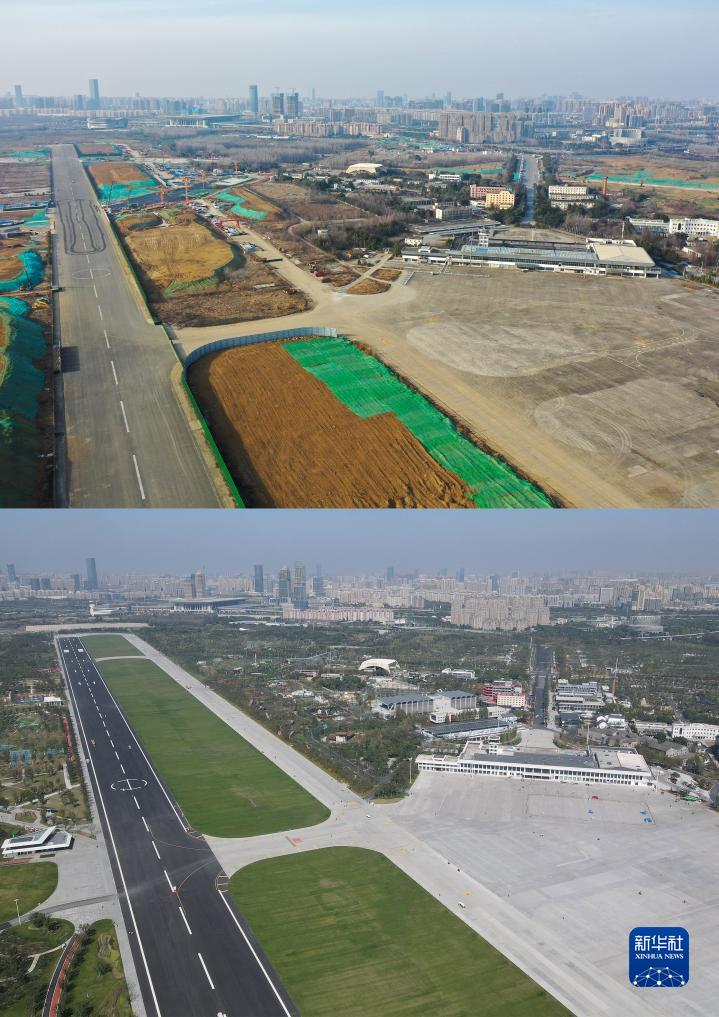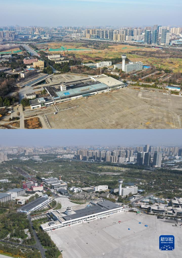 这是一张拼版照片:上图为2021年2月9日拍摄的已停用的合肥骆岗机场(无人机照片,新华社发 黄洋洋摄);下图为2023年10月17日拍摄的合肥骆岗公园(无人机照片,新华社记者周牧摄)。