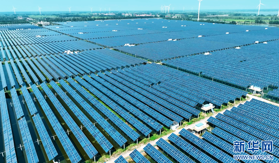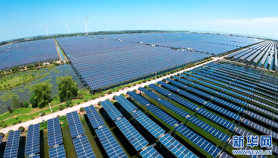 秋日时节,在安徽省滁州市天长市杨村镇东大圩,一排排光伏发电板架设在水面上,与田野相互映衬,构成一幅美丽的生态画卷。“渔光互补”光伏电站上层用于光伏发电,下层用于水产养殖,实现生态效益、经济效益的有机统一。