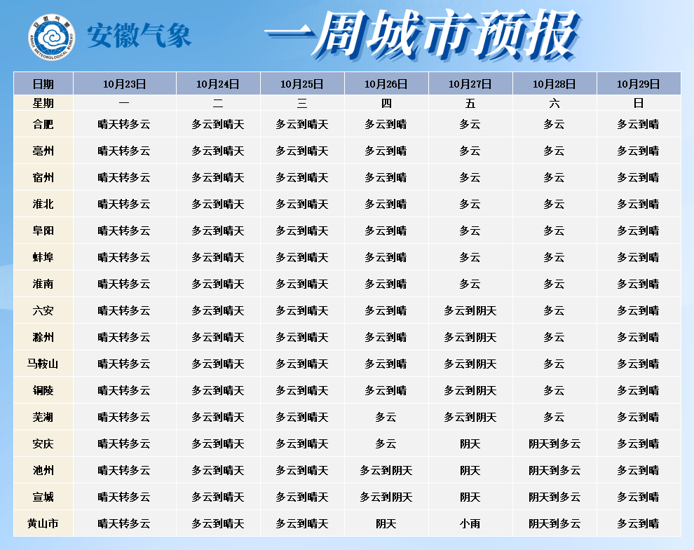 10月29日至11月1日(周日至周三):全省多云到晴天。