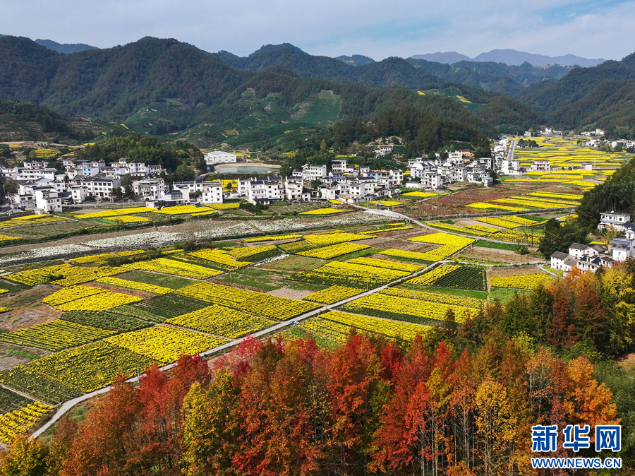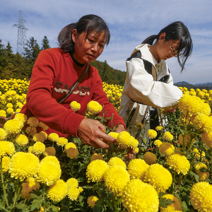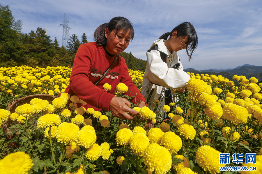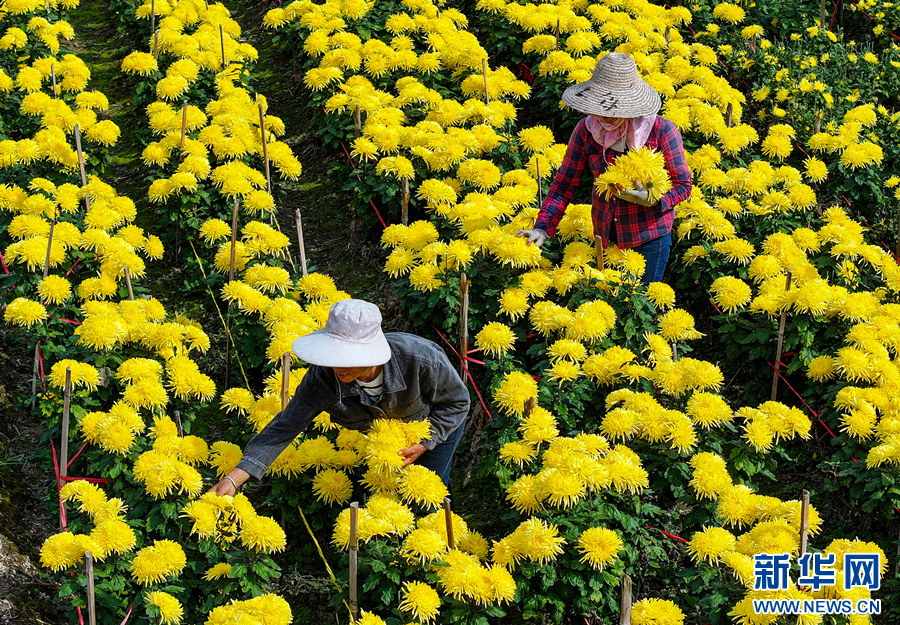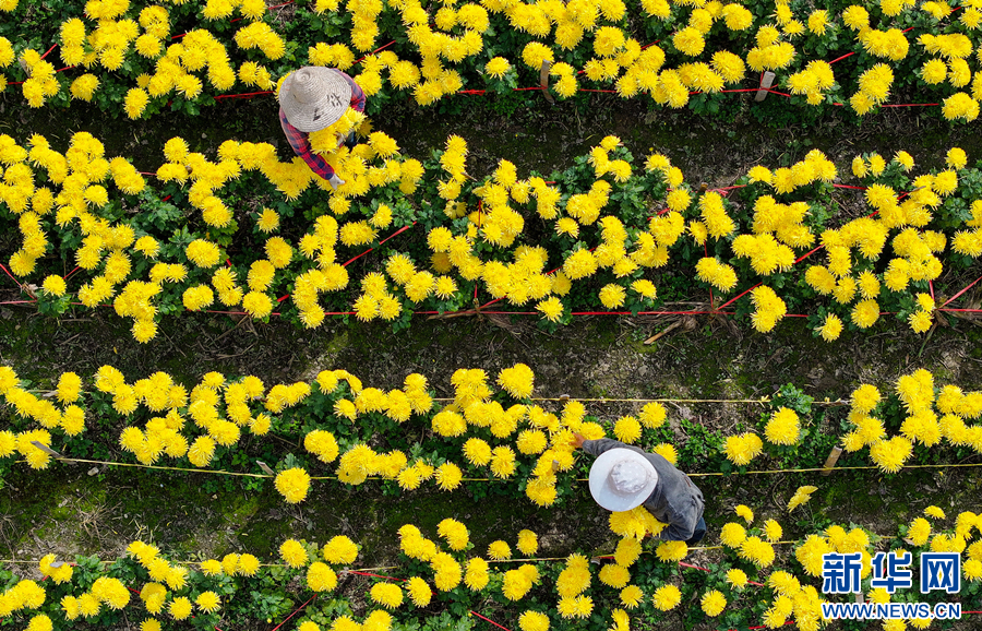 近日,安徽省黄山市歙县溪头镇万亩菊花陆续进入采摘期,农民趁着晴好天气采摘菊花,田间地头一派繁忙景象。 新华网发(施亚磊 摄)
