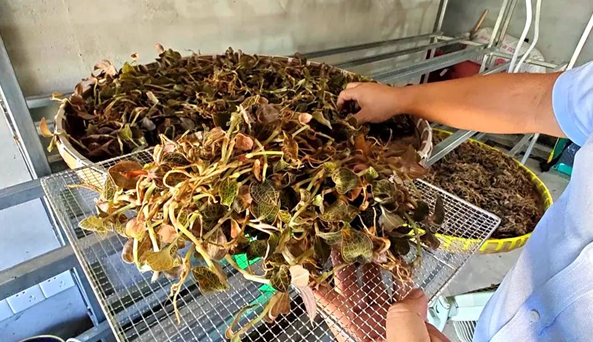 在团月村金线莲一期项目基地,一株株叶脉金黄、长势喜人的金线莲整齐生长在栽培架上,工人正有序地采收、清洗、烘干,经过5个多月的生长,金线莲已进入采收期,这也意味着团月村金线莲项目试种成功。