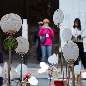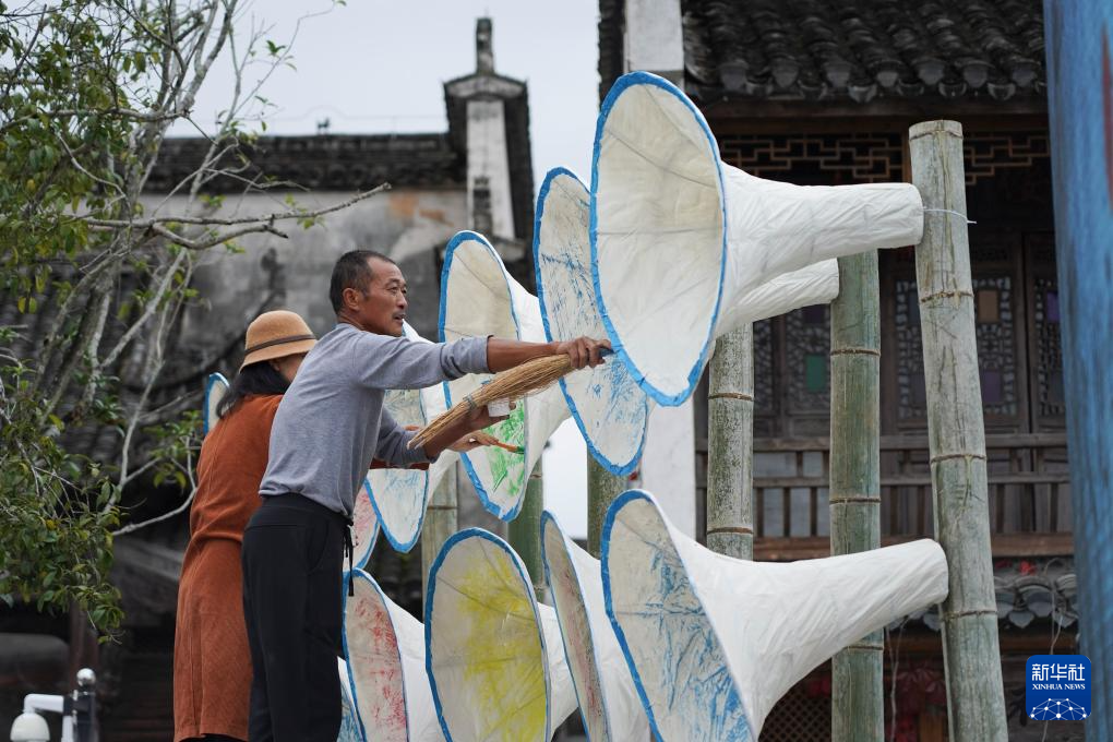 11月11日,人们在叶氏支祠外的广场上绘制喇叭状的纸工艺品,作为展览开幕式的布景。