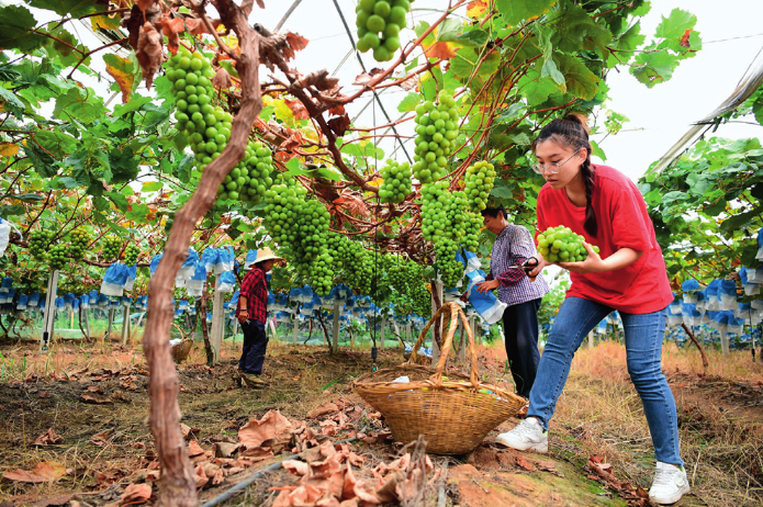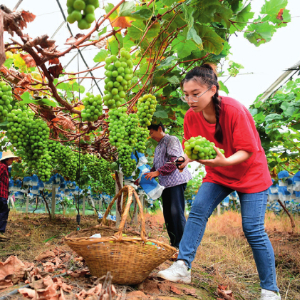 “95 后”海归硕士回到安徽省合肥市肥西县,成为田园“创客”,在田间地头直播推介自家的葡萄(2023年8月30日摄) 刘军喜摄/本刊