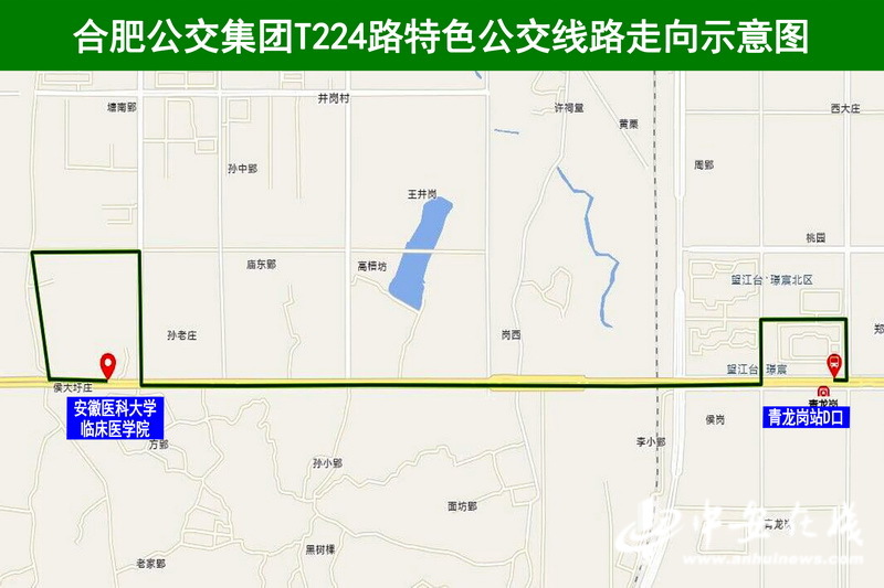 T224路特色公交停靠站点:安医大临床医学院、安医大临床医学院北、安医大临床医学院东、侯望路口、青龙岗;返程时停靠青龙岗、安医大临床医学院、安医大临床医学院北、安医大临床医学院东。