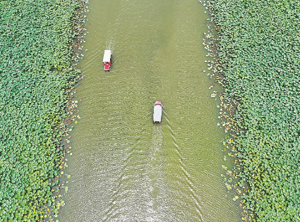 2023年7月9日,芜湖市湾沚区陶辛镇陶辛水韵荷花景区,游客或乘坐游船在荷花荡中游览,或在荷花从中赏花、拍照。本报通讯员 王玉实 摄
