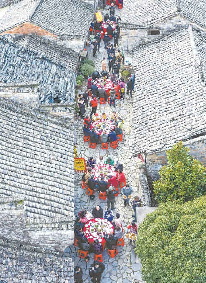 2023年2月21日,芜湖市湾沚区红杨镇西河古镇,游客与古镇居民在百家宴上同吃同乐。本报通讯员 肖本祥 摄