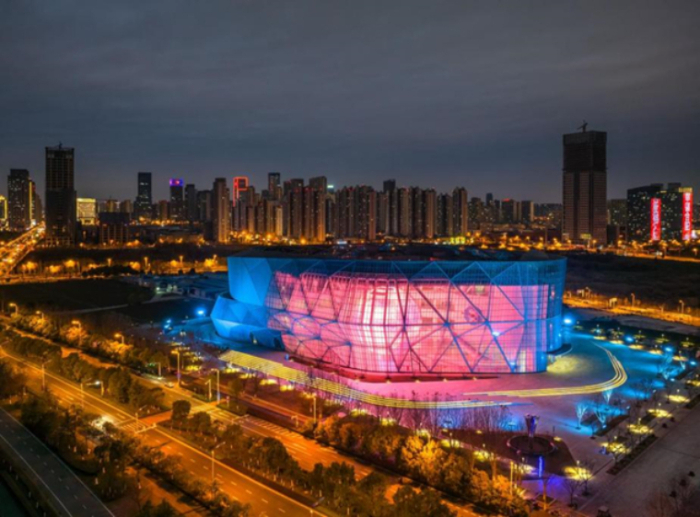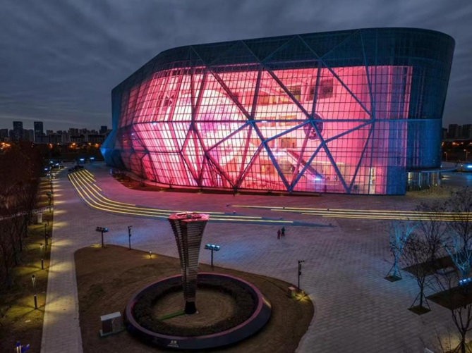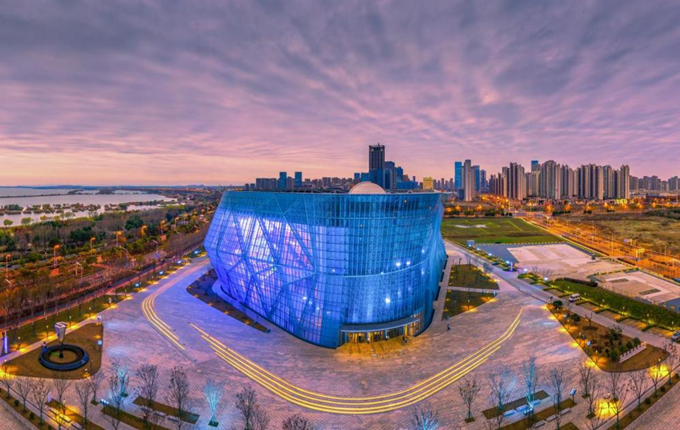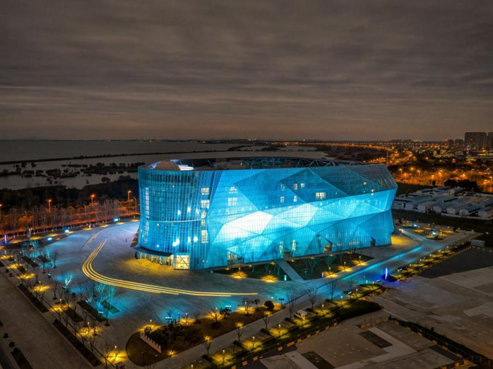 12月17日,合肥市巢湖岸边的安徽省科学技术馆(新馆)灯光璀璨。