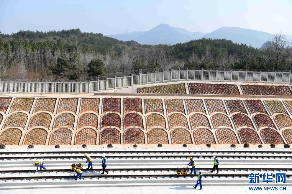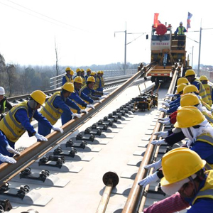 1月16日,中铁六局施工人员在宣绩铁路铺轨施工现场作业。