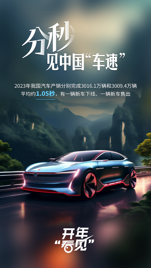 这意味着2023年的中国,平均约1.05秒,有一辆新车下线、一辆新车售出;平均约3.3秒,有一辆新能源汽车完成产销。