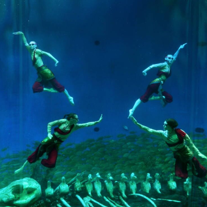 身穿古装的演员,在水中曼妙舒展,优美的体态,高难度的舞姿,时而轻缓优雅,时而快若流星,柔美与力量完美结合,别具特色的水下表演吸引众多游客参观。