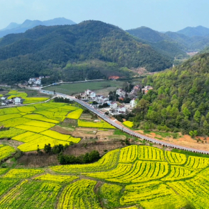 三月的乡村春意盎然,安徽省铜陵市义安区钟鸣镇的油菜花陆续盛开,漫山遍野的金黄色如波浪翻涌,勾绘出一幅美丽的春天画卷。