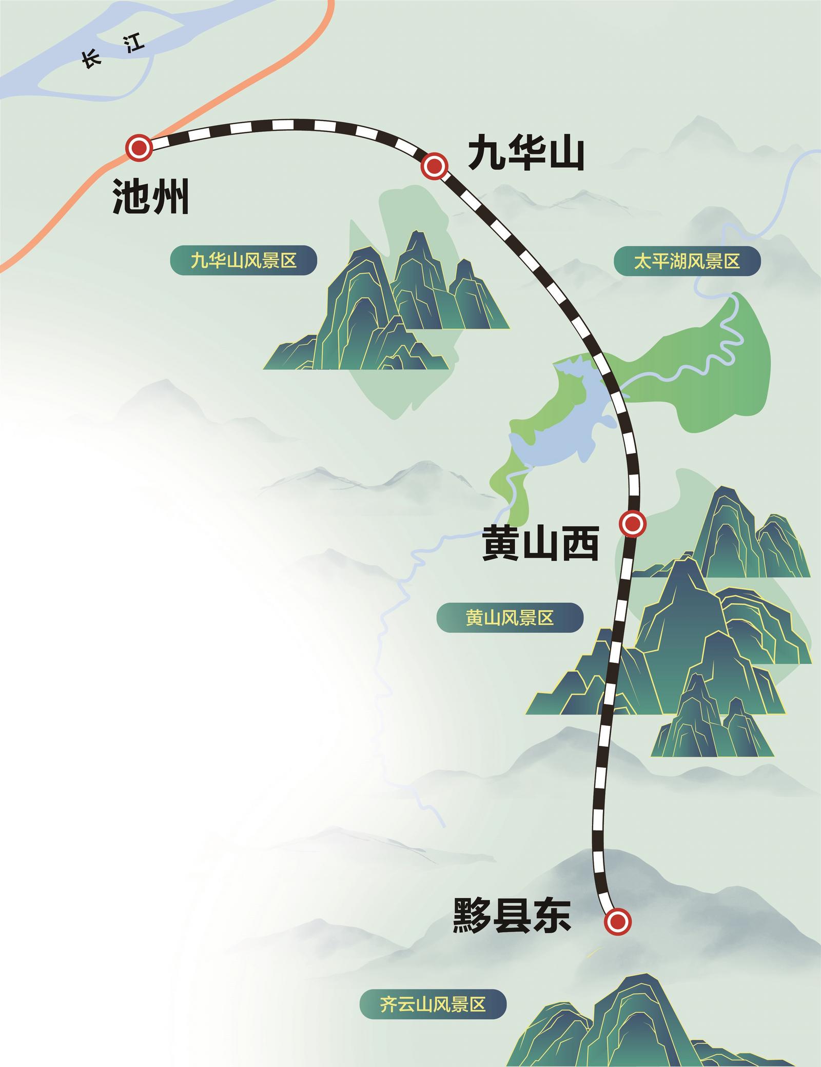 池黄高铁起自池州站,途经池州市贵池区、青阳县,黄山市黄山区、黟县,终至黟县东站,正线全长约125公里,设计时速350公里。全线设池州、九华山、黄山西、黟县东4座车站,其中九华山、黄山西为本线新建车站,池州站为既有改建车站,黟县东站为既有车站。