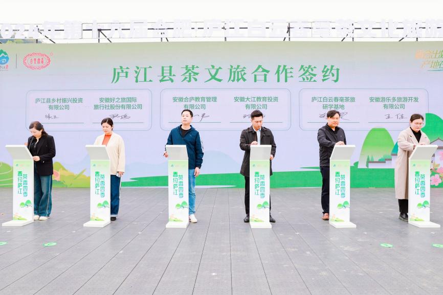 活动现场,原创歌曲《茶香醉庐江》、“春采茶、夏摘果、秋登高、冬泡汤”文旅推介、茶旅露营车展、非遗互动体验等一系列精彩节目,展现了庐江茶文旅相融共生的美好图景。庐江县柯坦有机茶厂、安徽环宇生态农业有限公司、安徽白云春毫茶业开发有限公司、合庐研学教育基地等10余家企业分别与合作单位签署了庐江县茶文旅协议,合力打造“白云春毫”茶叶公共品牌。