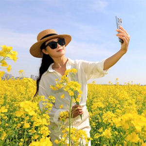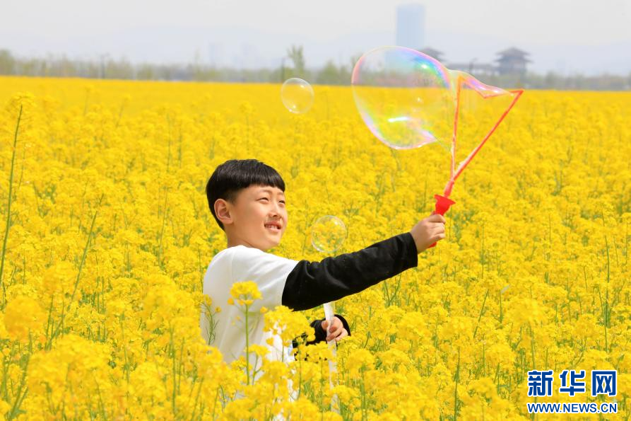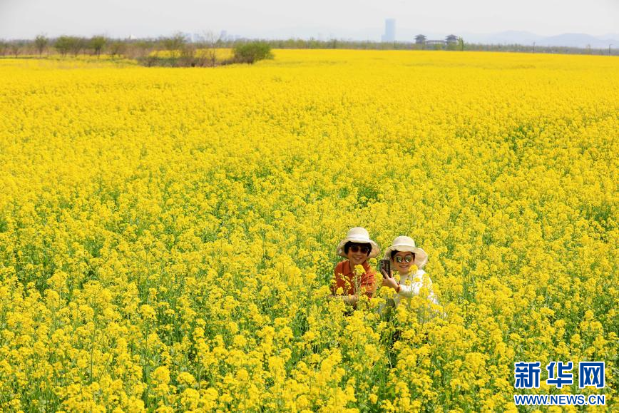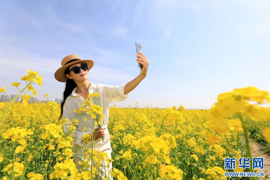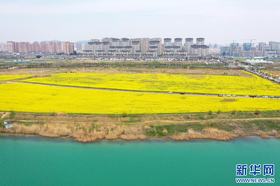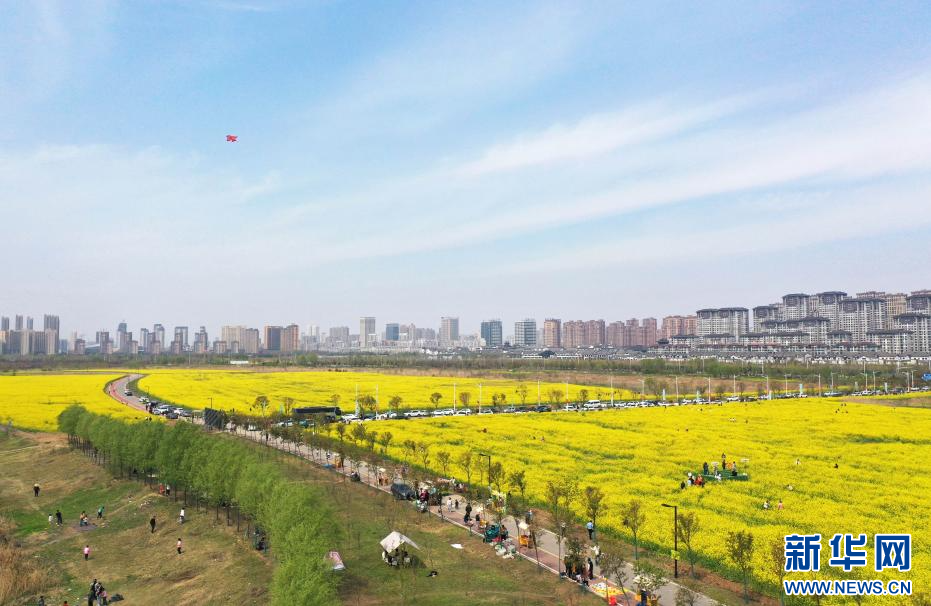 4月5日,安徽省淮北市中湖湿地公园油菜花盛开,形成一片金色的海洋,吸引众多游客前来赏花踏青。
