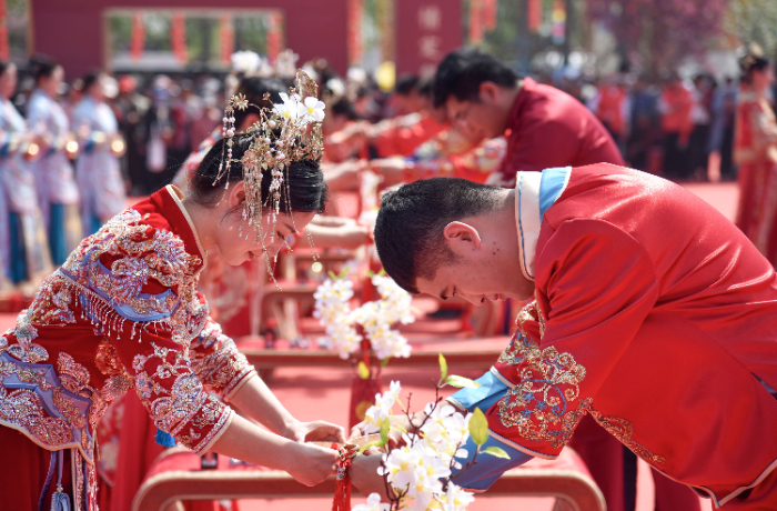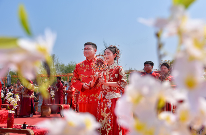 4月8日,“团聚新时代情定梨花海”安徽省暨宿州市第三届集体婚礼在砀山县老梨园里举行,26对新人以花为媒、万众见证,携手走进婚姻殿堂。参加本次中式集体婚礼的新人们来自各个乡镇、不同行业,他们是平凡岗位的奋斗者,也是文明婚俗的践行者和推动者。