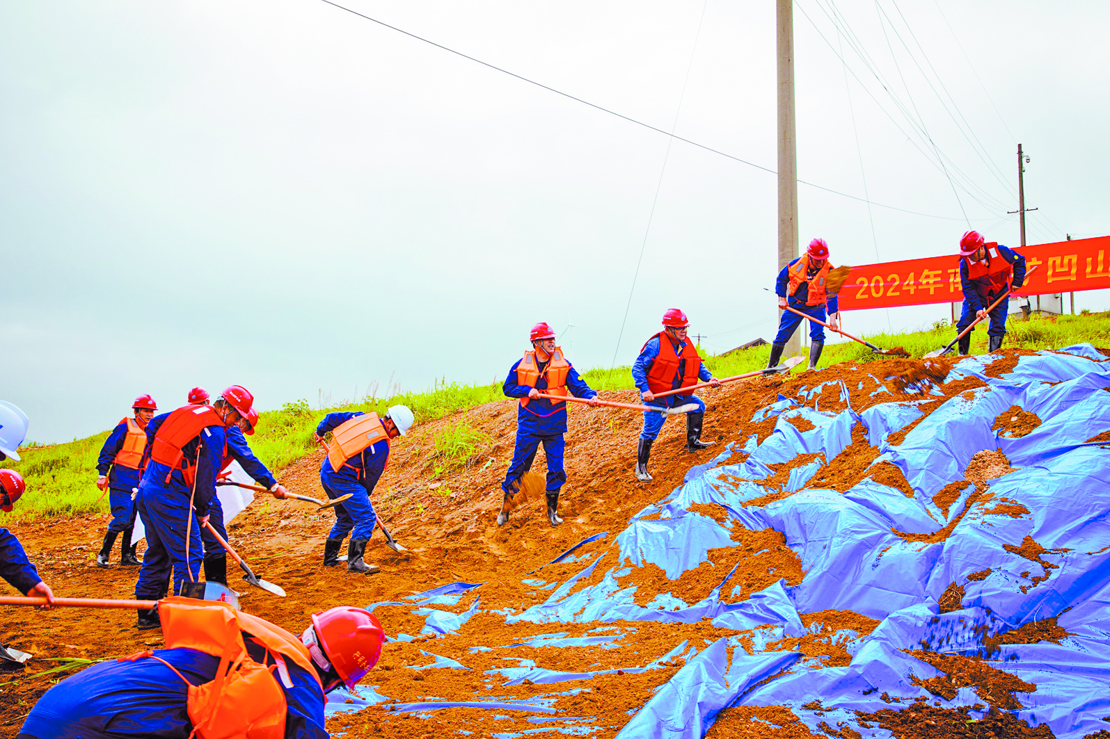 本次演练场景设定为雨山区连续强降雨,尾矿库坝面排水沟被杂物堵塞,库内的水位不断上升,坝前干滩距离急剧减少,大量雨水直接冲刷坝面,出现坝面局部垮塌的迹象,洪水有漫坝风险,对下游群众的生命财产构成严重威胁。巡坝人员发现“险情”后立即上报,企业应急领导小组接到报告后迅速启动尾矿库汛期应急救援预案并报告应急部门和属地政府,安排各小组赶赴现场应急抢险,属地政府指挥下游群众撤离至安全区域。通过各组有序抢险救援,坝体垮塌部位得到加固,排洪系统得到疏通,库内水位下降到警戒水位以下,受伤人员得到及时救治,险情得以排除。