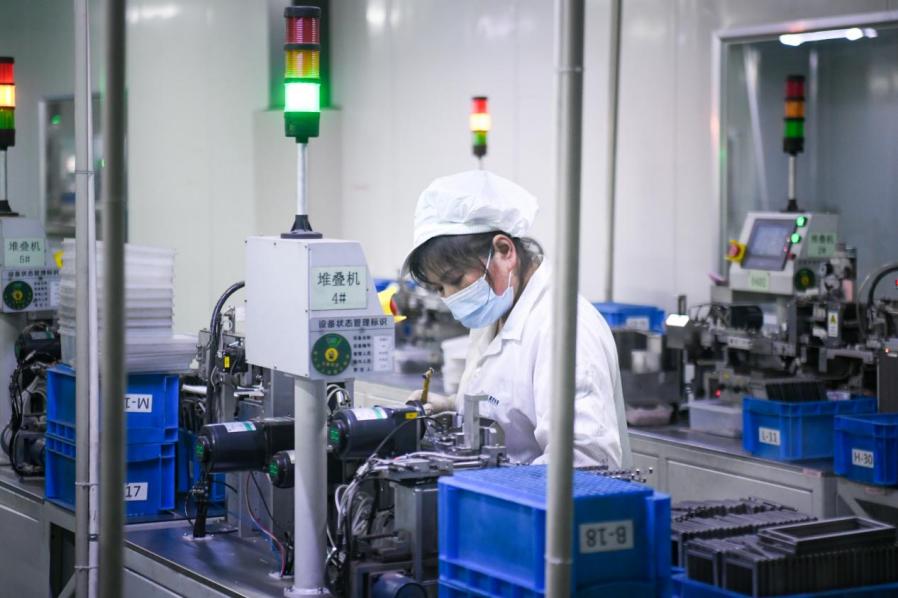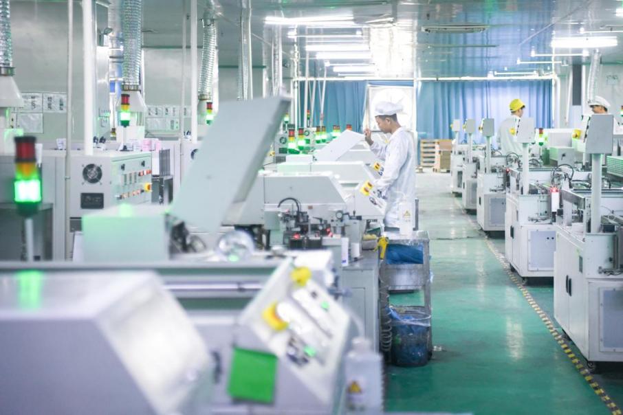 5月14日,安徽省马鞍山市郑蒲港新区半导体高新科技产业园一公司内,工人正在生产贴片电阻产品。