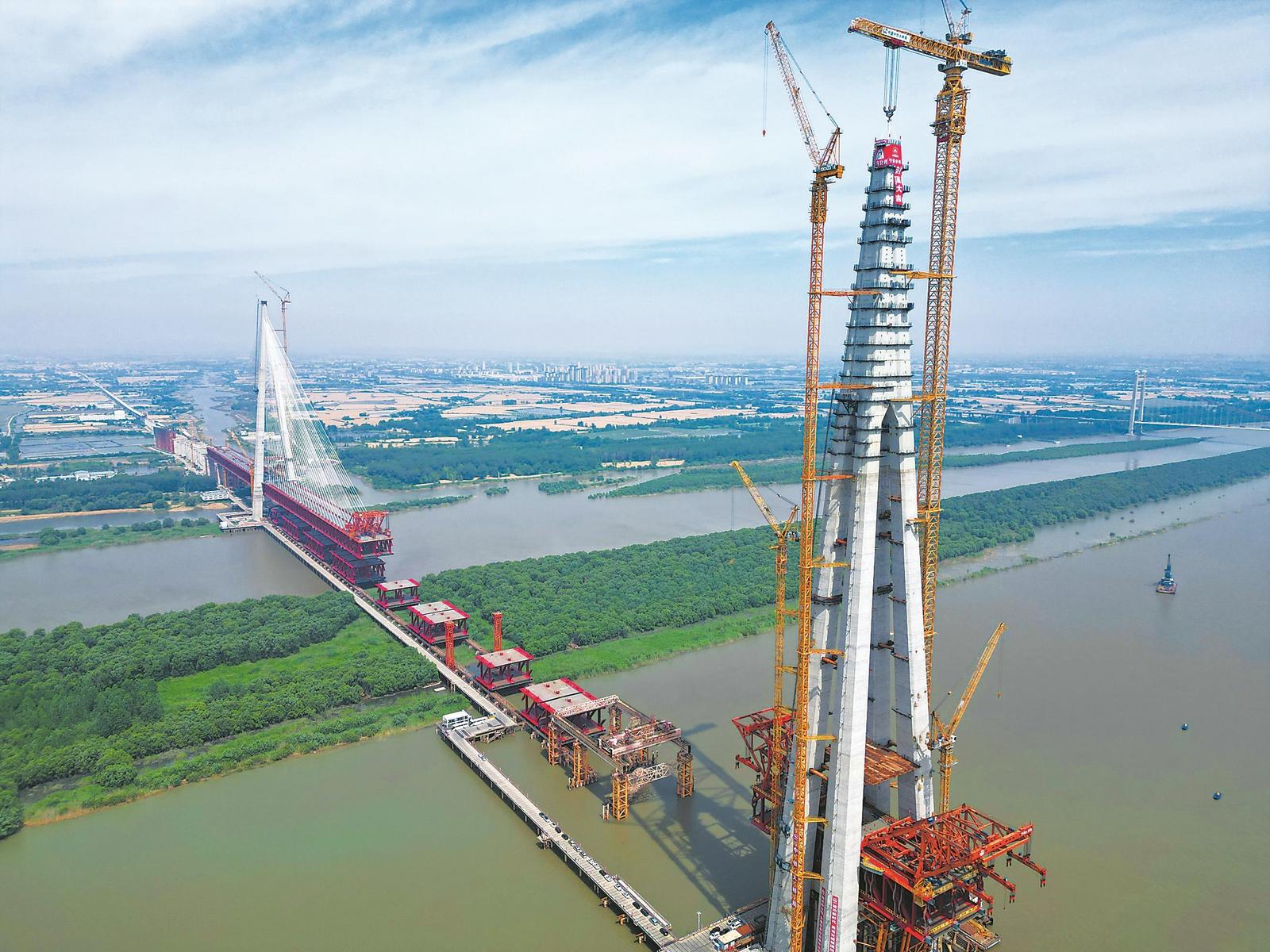此次封顶的4号主塔高345.6米,相当于115层楼高,是目前安徽最高的桥塔。