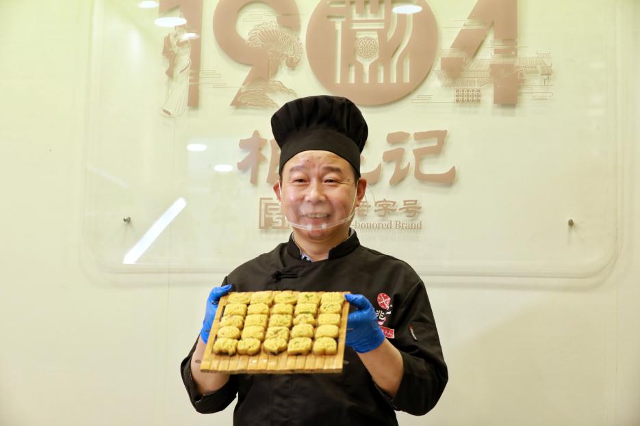 5月21日,“中华老字号”柏兆记合肥首店重新装修焕然一新,非遗大师路四九现场展示国家地理标志产品——大观绿豆糕(又名八宝绿豆糕)的非遗制作技艺。