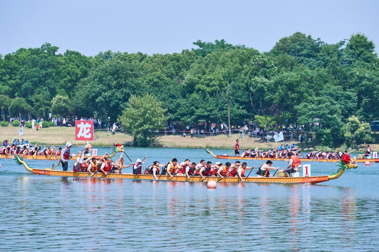 千帆竞发,百舸争流。伴随着清脆的发令声响,一支支龙舟犹如离弦之箭般驶出,鼓声震天,铿锵有力,运动员们精神抖擞、奋勇争先、动作整齐划一。本届龙舟赛设直道竞速500米、200米两个项目。