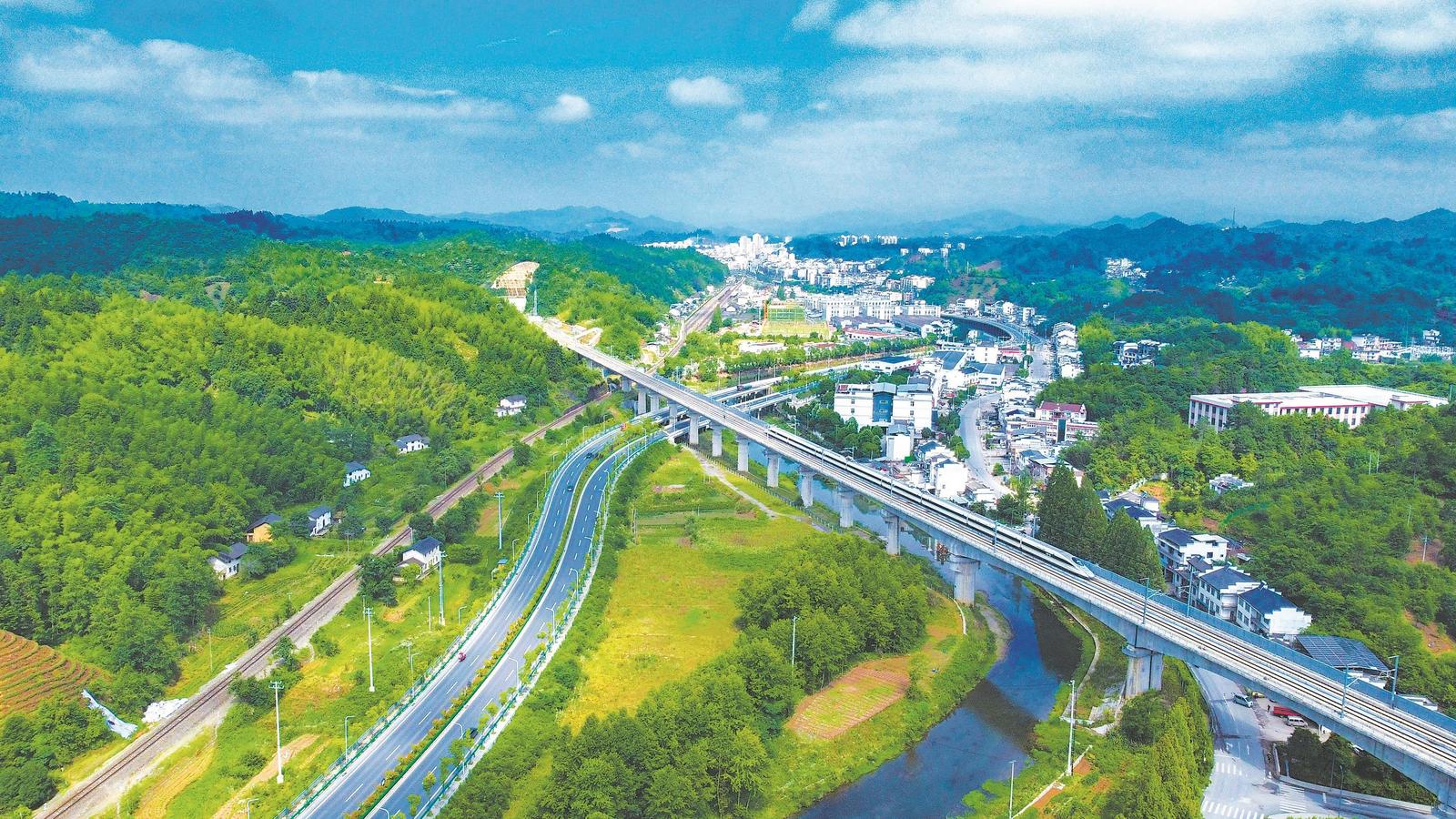 6月13日,祁门县相互交错的铁路、公路交通路网,在青山绿水的映衬下,构成了一道亮丽的风景线。