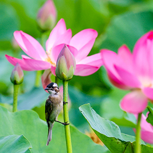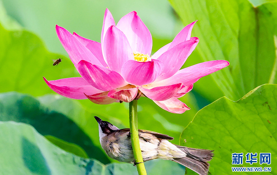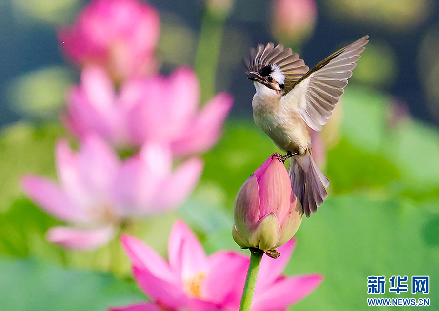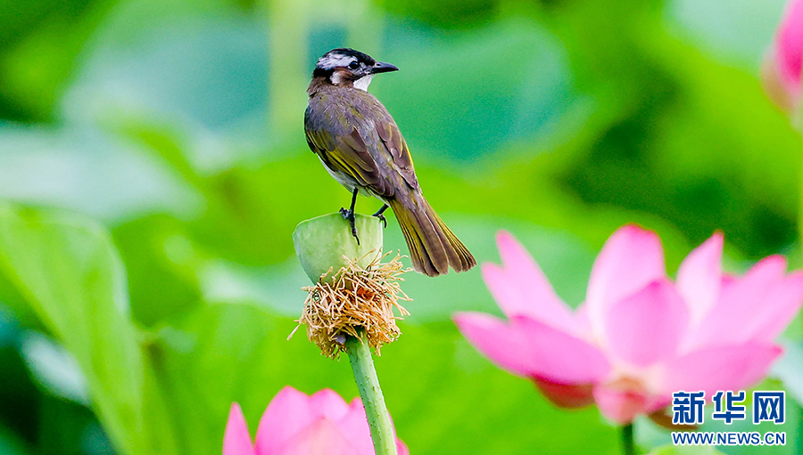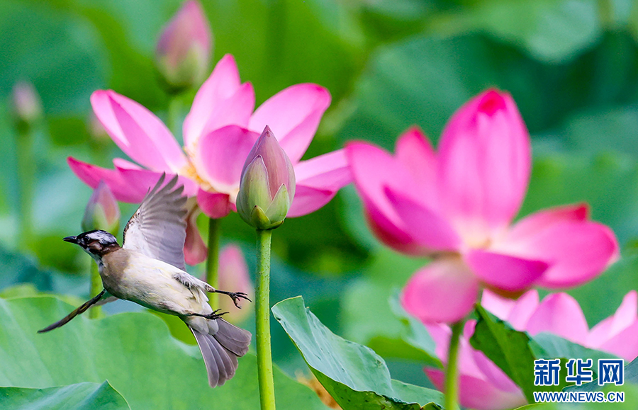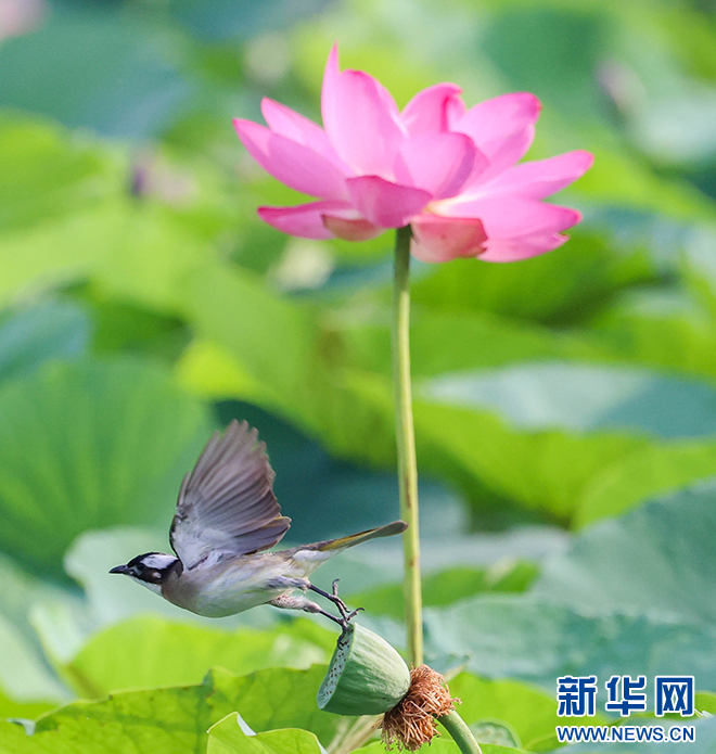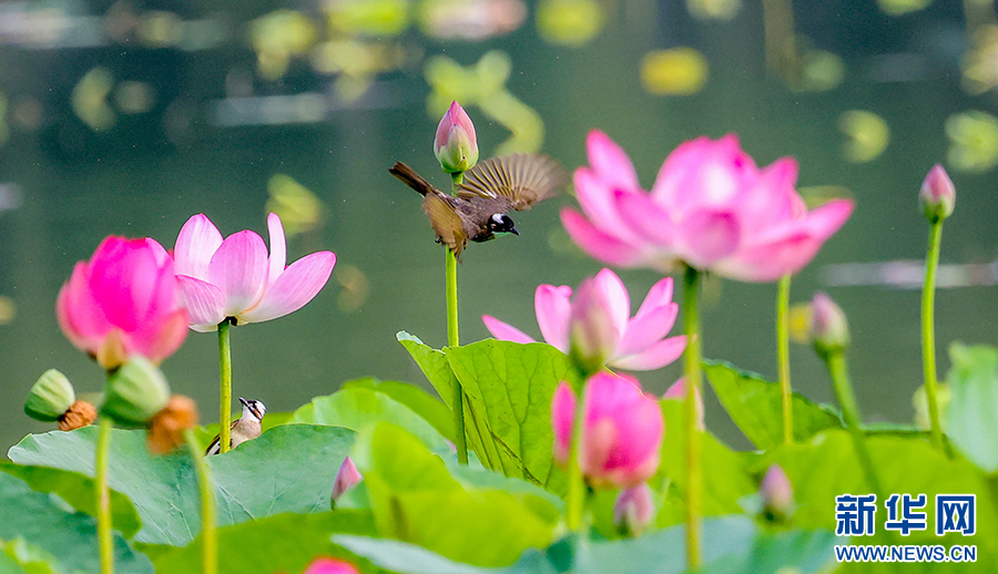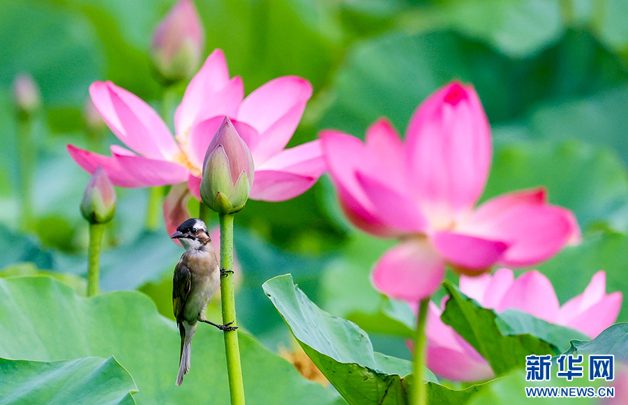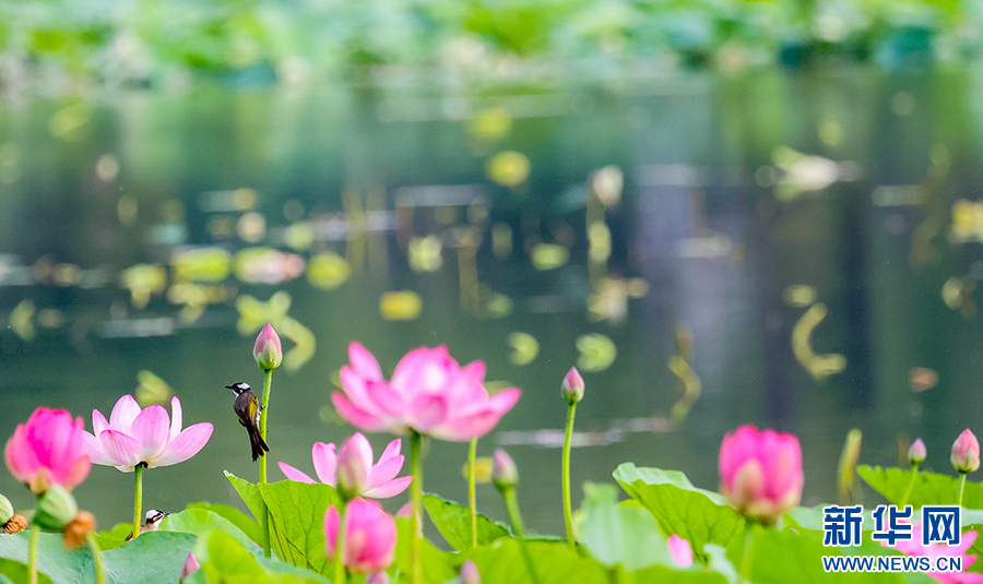 仲夏时节,安徽省淮北市桓谭公园的荷花竞相绽放,鸟儿穿梭其间,嬉戏、觅食、停歇,成为夏日里一道生态美景。新华网发(王文 摄)