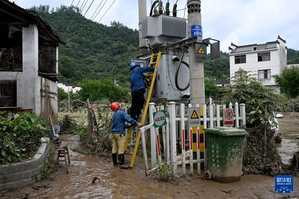 6月21日,在安徽省黄山市歙县坑口乡,国网歙县供电公司工作人员在抢修供电线路。