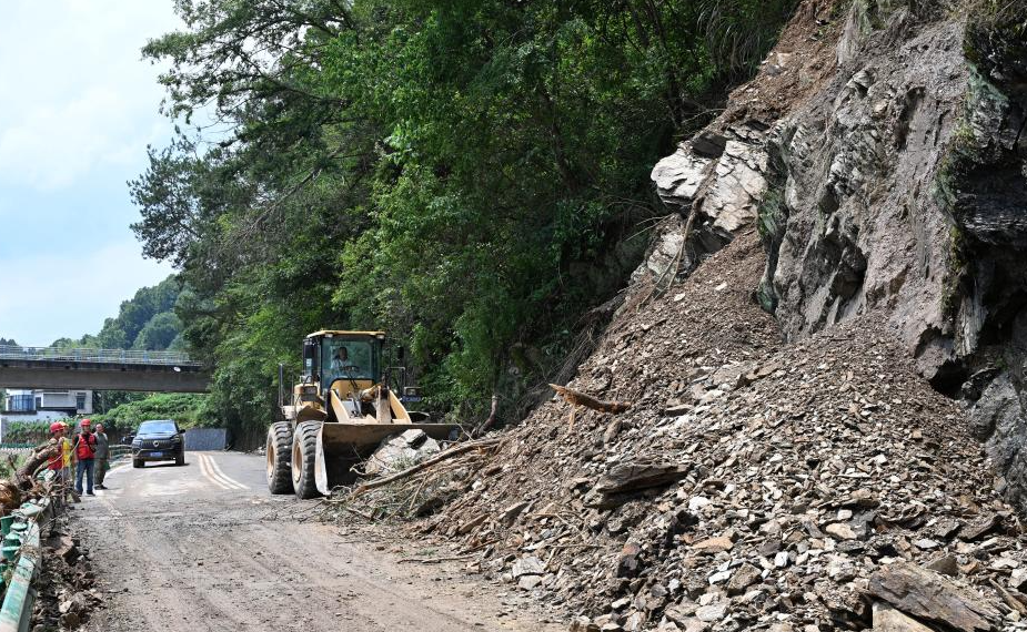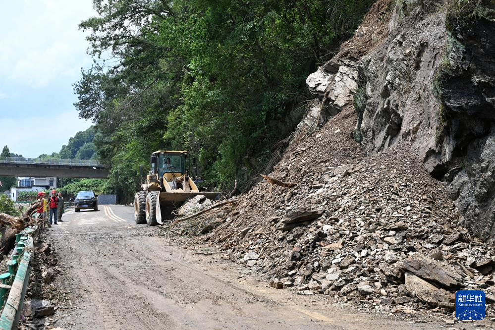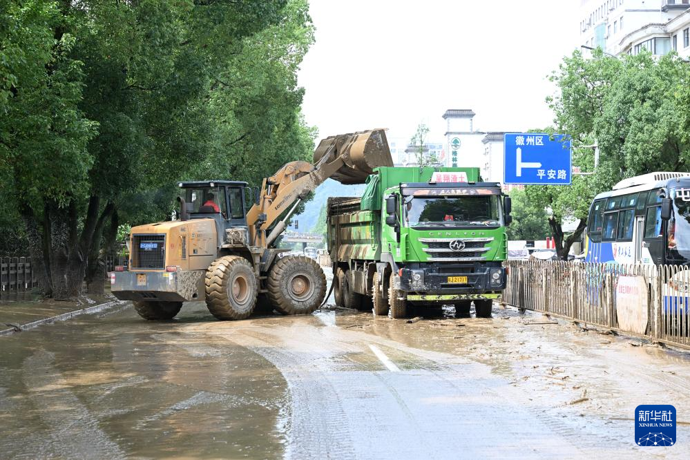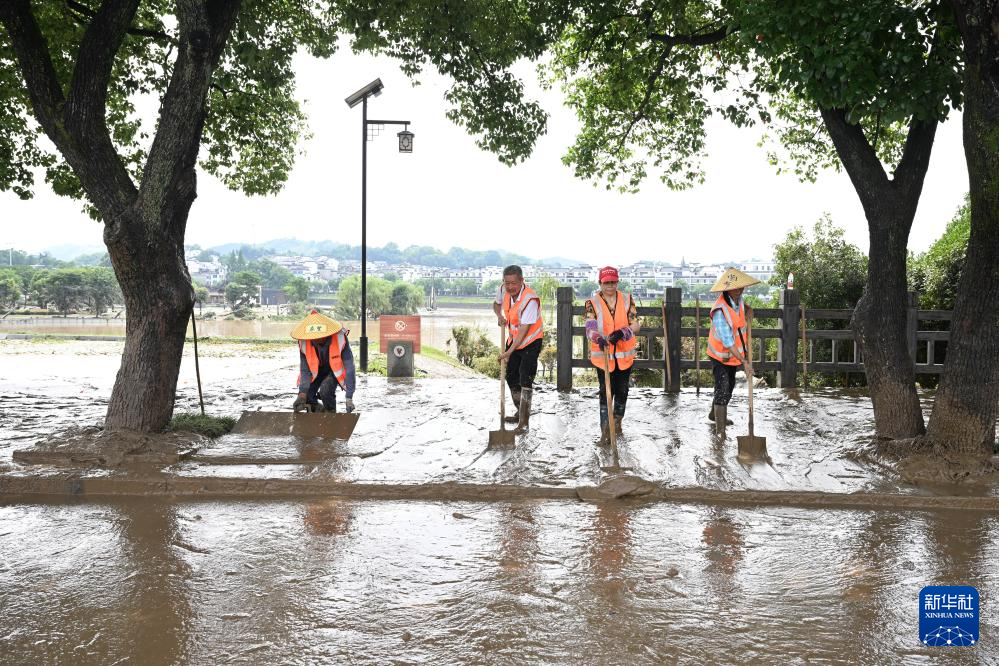 6月21日,在安徽省黄山市歙县徽城镇南屏村,工作人员在清理道路。