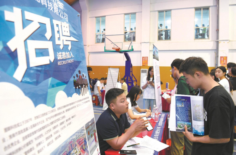6月26日,大学生在求职现场咨询。当日,“勇往‘职’前 就有未来”2024年校园双选会在安徽水利水电职业技术学院举办。