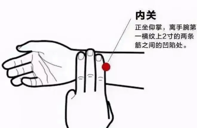 内关穴:位于前臂前区,腕掌侧远端横纹上2寸(大约三横指宽度),在掌长肌腱与桡侧腕屈肌腱之间。