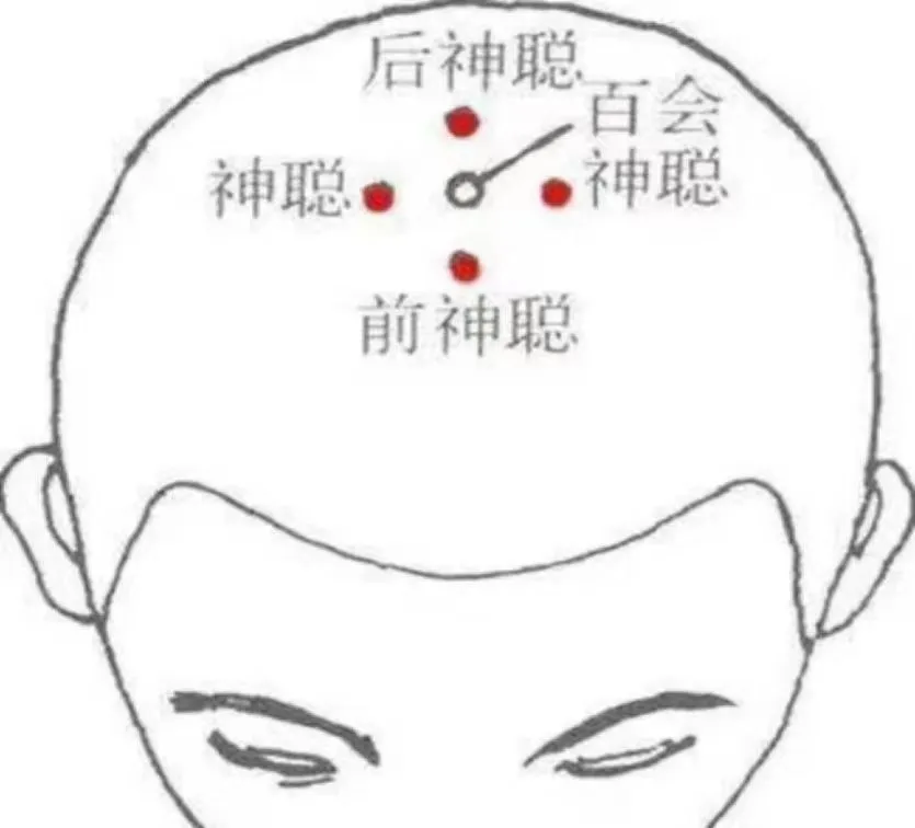 四神聪穴:百会穴前后左右各一寸处的四个点组成。