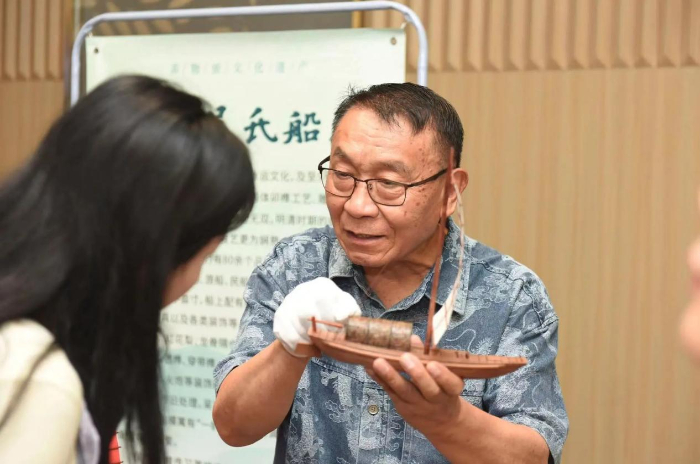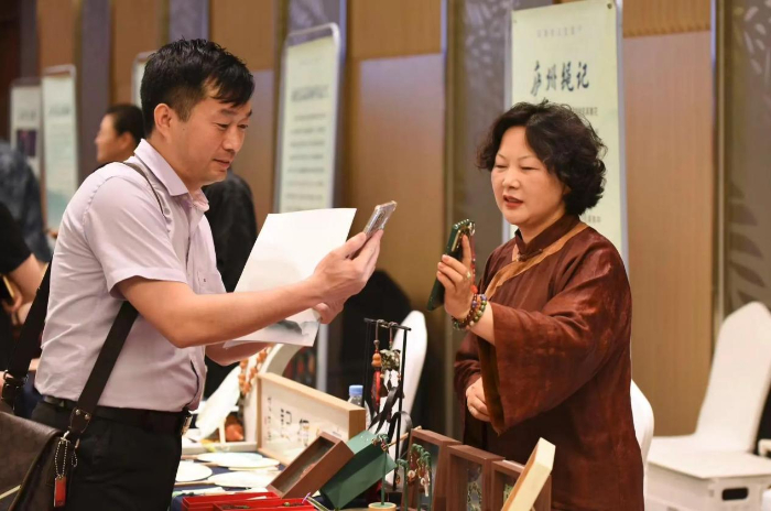 非遗传承人向与会人员展示非遗作品。
