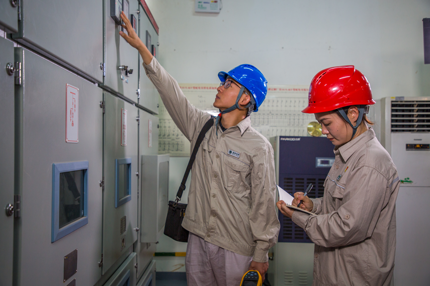 7月15日,在合肥延锋云鹤汽车座椅有限公司自管配电房内,合肥肥西县供电公司工业园供电所客户经理夏国威等协助用户对电力设备进行安全检查。