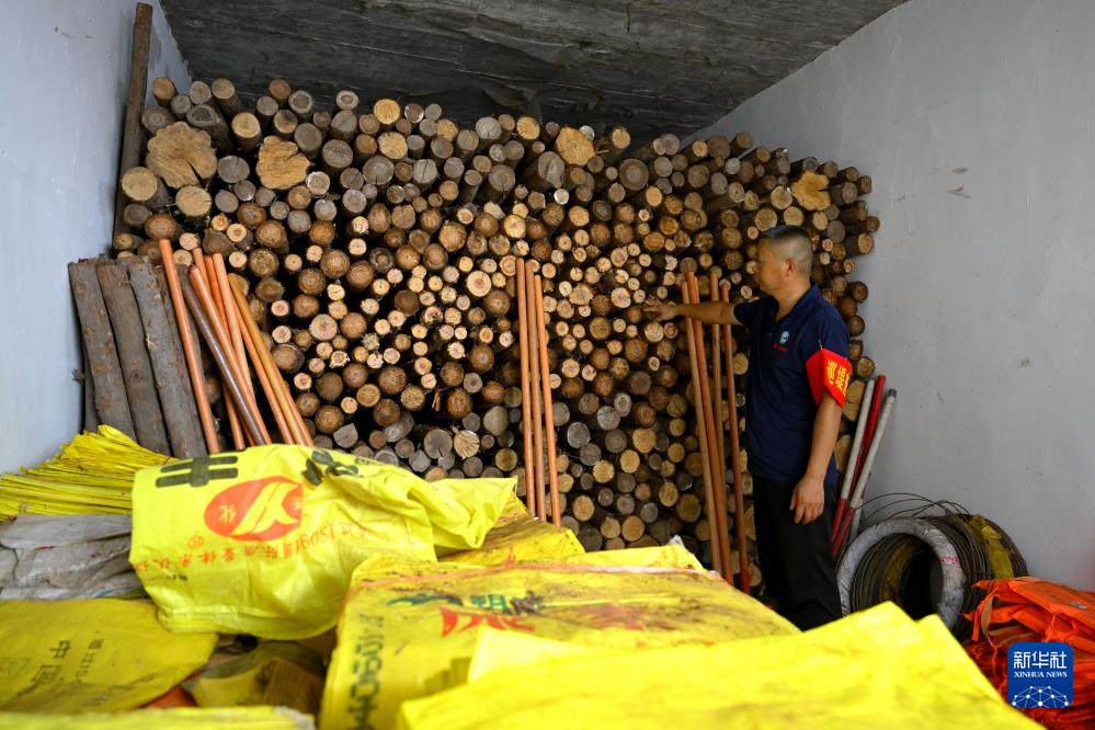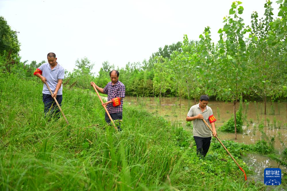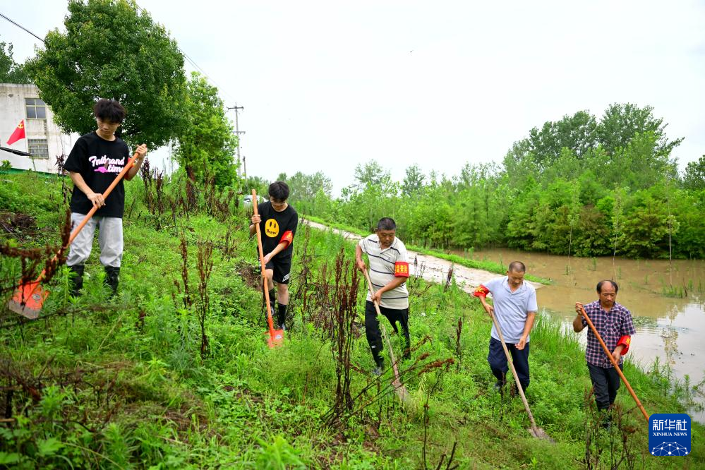 7月14日,阜南县王家坝镇王家坝村巡堤查险队队员在检查防汛物资。