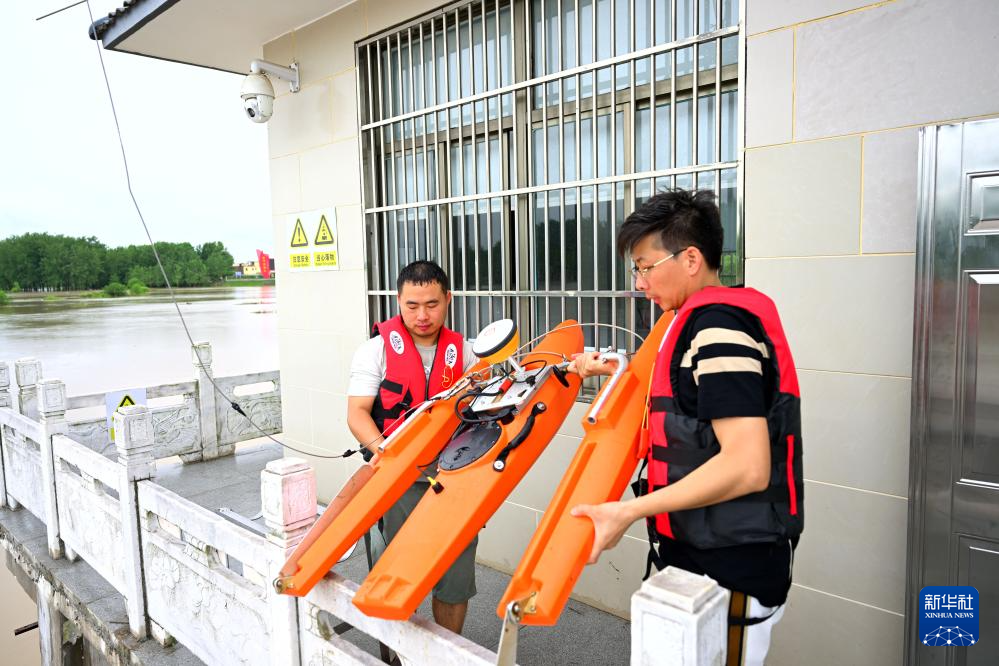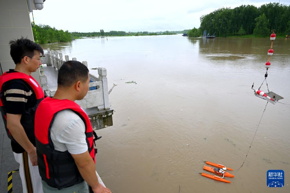 7月14日,在安徽省阜南县,王家坝水文站工作人员利用仪器测量淮河流量。