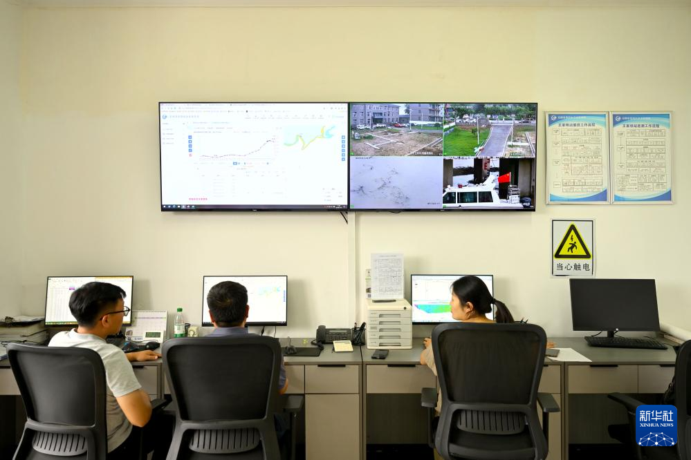 7月14日,在安徽省阜南县,王家坝水文站工作人员在监测淮河水情。