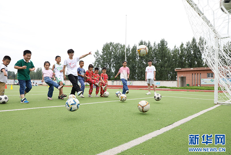 7月16日,在安徽省合肥市肥西县山南学区中心学校,大学生志愿者和孩子们一起踢足球。