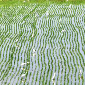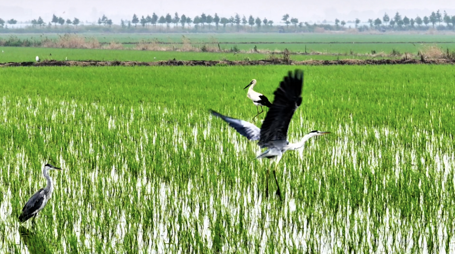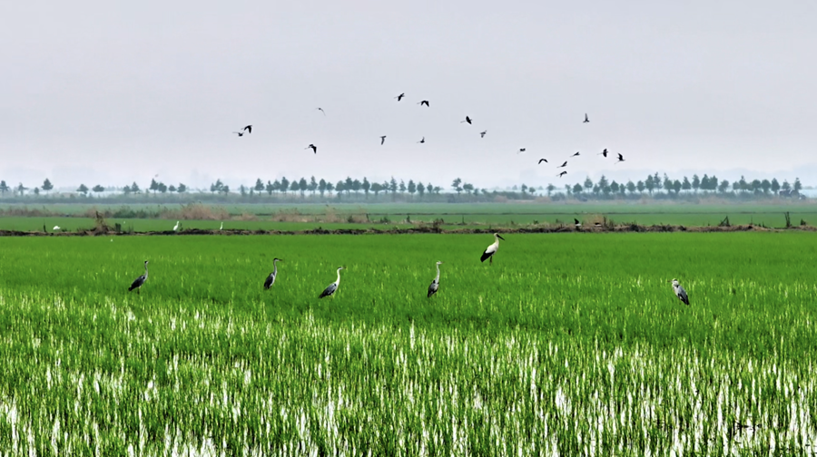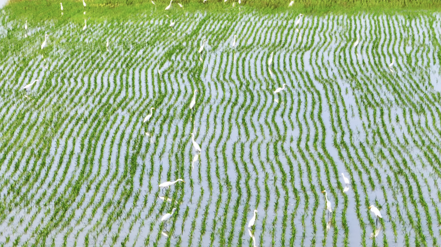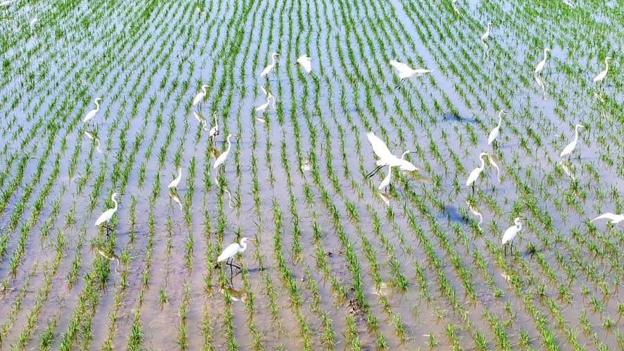 夏日的田野生机勃勃,在安徽省颍上县唐垛湖星罗棋布的水田里,成群结队的水鸟翩然起舞,轻盈的身姿与翠绿的秧苗相互映衬,充满了灵动之美。