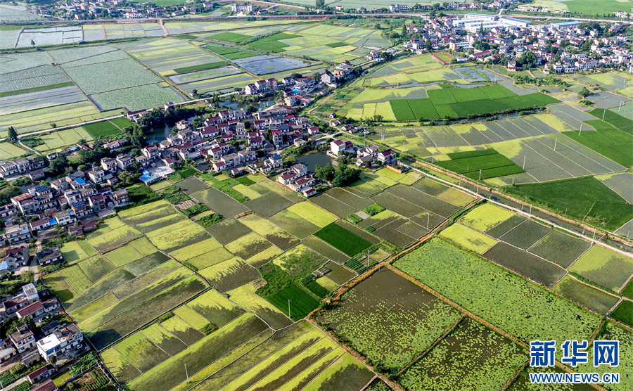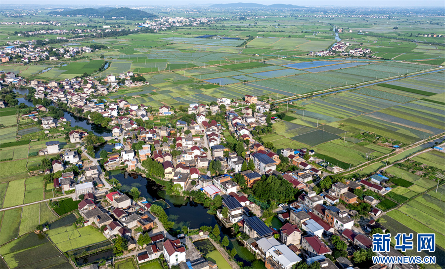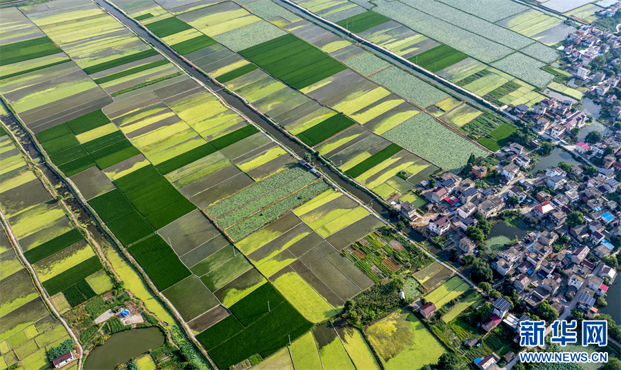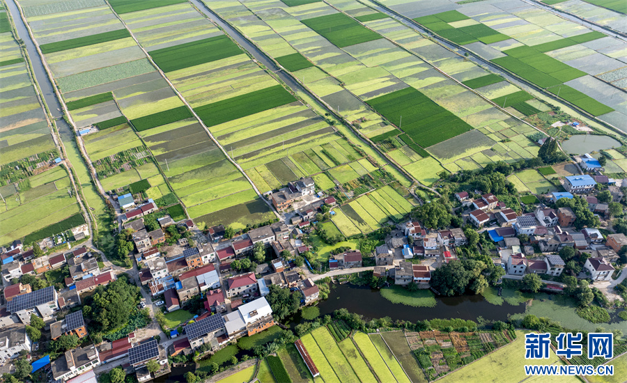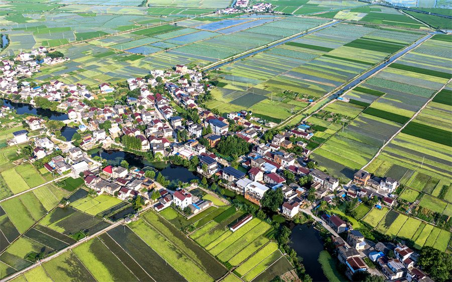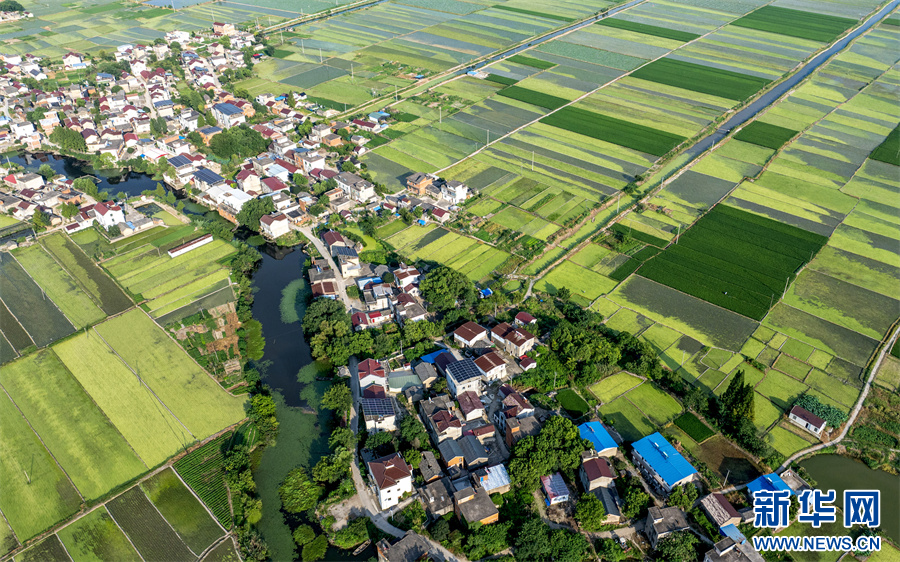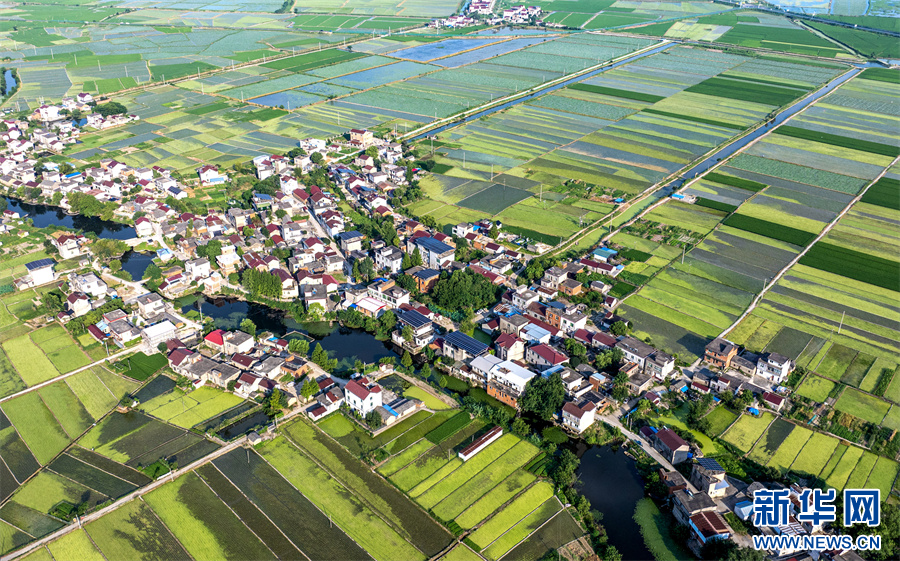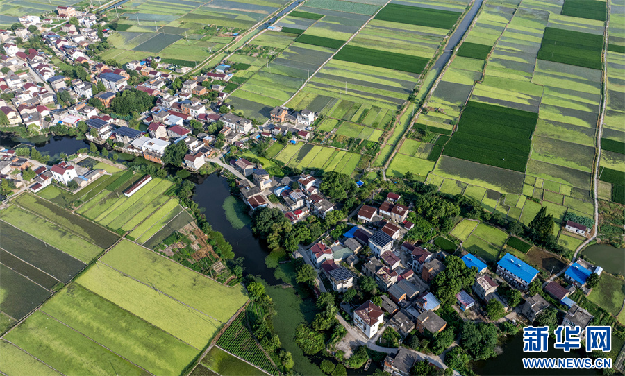 7月24日,航拍镜头下的安徽省合肥市庐江县白湖镇西城村,青绿田块交相辉映,白墙红瓦的农舍点缀其中,景美如画。