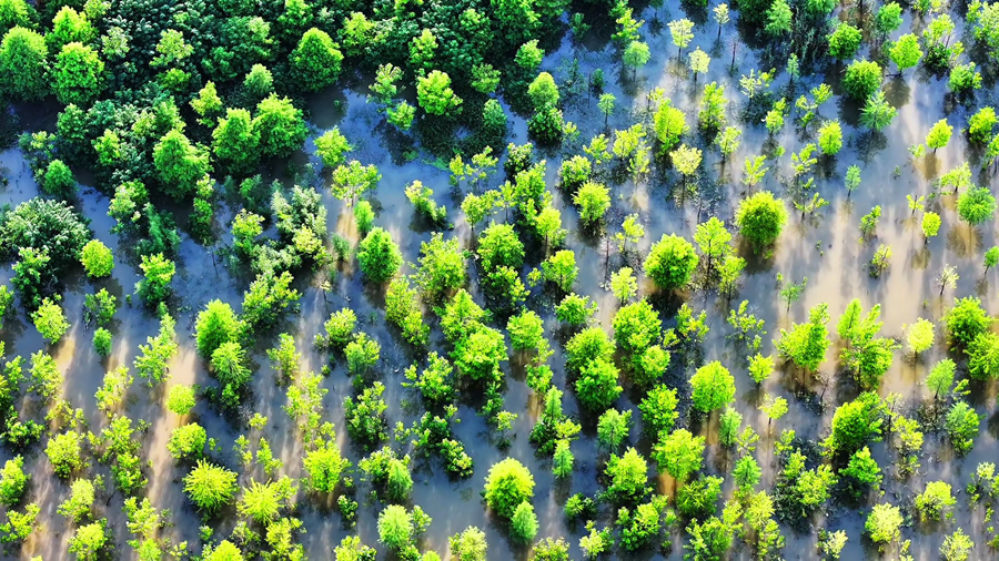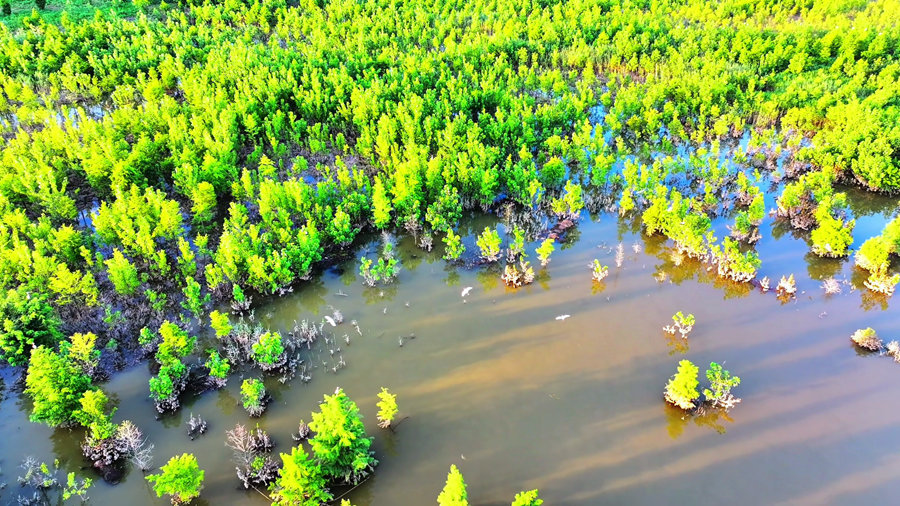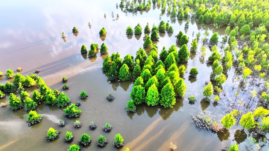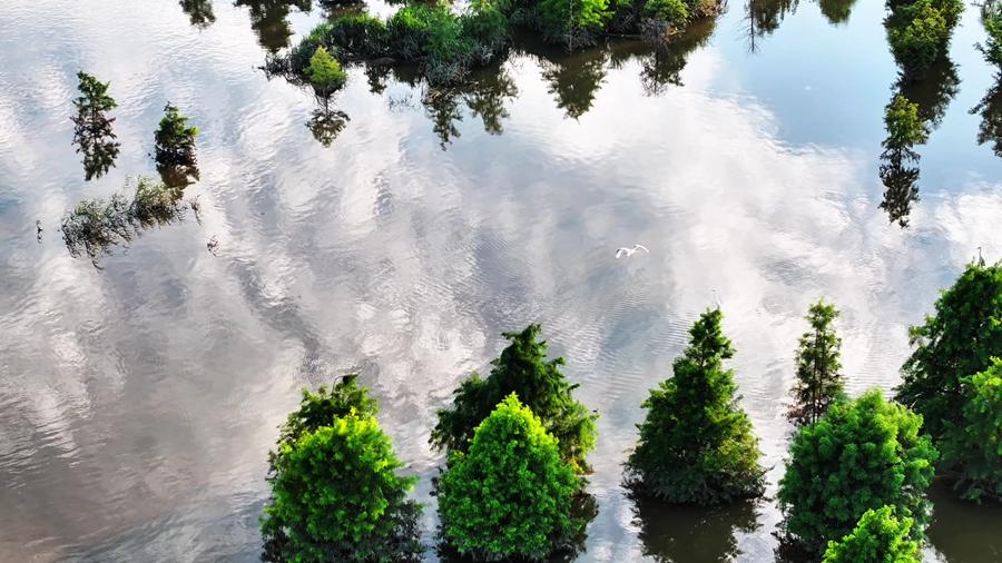 初秋的安徽省颍上县江心洲湿地,秋水盈盈,天光云影,鹭鸟翩跹,呈现出一幅美丽和谐的生态画卷。