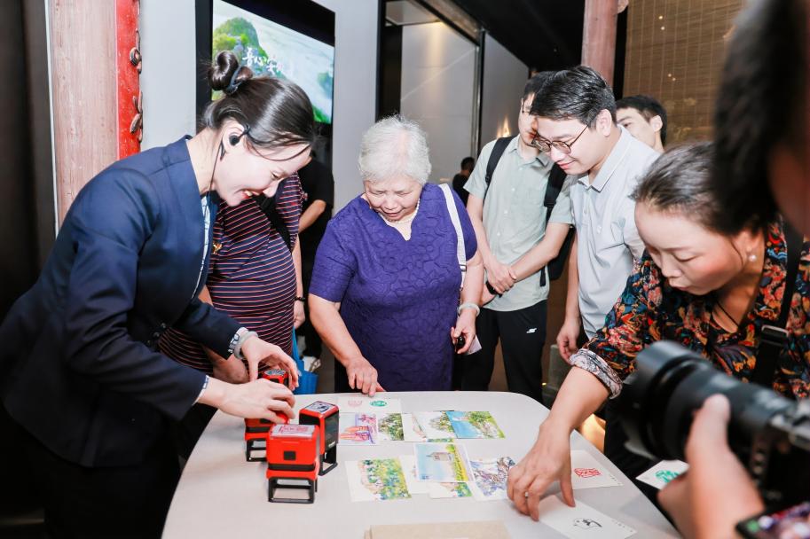 在前台处,徽商故里工作人员还为赵阿姨专门设置了黄山印信,赵阿姨在众多明信片中挑选了迎客松,并合影留念。