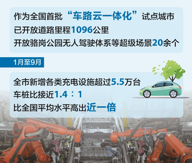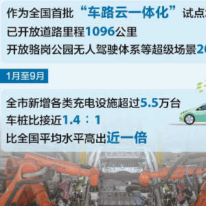 作为全国首批“车路云一体化”试点城市,合肥积极推动智能网联汽车地方条例出台,开放道路里程1096公里,开放骆岗公园无人驾驶体系等超级场景20余个,成为全国首个“全域开放”的省会城市。为进一步形成良好“生态圈”,1月至9月,合肥全市新增各类充电设施超过5.5万台,车桩比接近 1.4∶1,比全国平均水平高出近一倍。基本建成城区2公里充电服务圈,建成换电站100余座,涵盖出租车、轻卡、重卡等全场景。