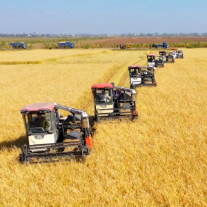近日,安徽省阜阳市颍上县70万亩水稻全面进入收获期,颍上县王岗镇备足农机,趁着晴好天气加快收获进度,将“丰收在田”转化为“丰收在手”,确保秋粮颗粒归仓。