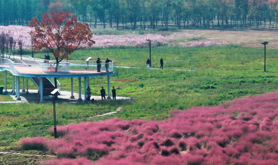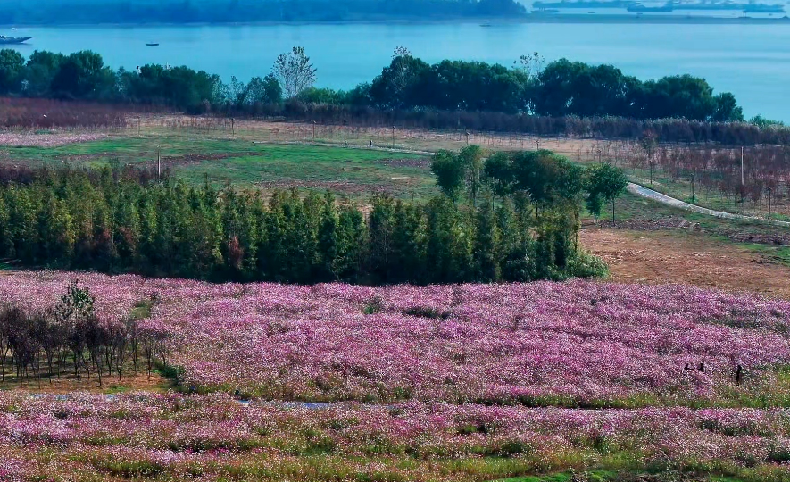 初冬时节, 安徽省马鞍山市浮沙圩公园内,色彩斑斓,鲜花满地,粉黛子草大片盛放,吸引不少游客前来游玩打卡。