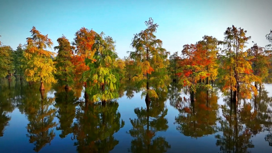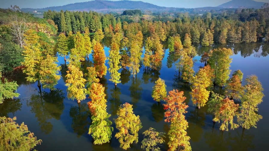 走进位于安徽省马鞍山市和县凹山水库的香泉水杉林,一株株水杉树形秀丽、色彩斑斓,与水面相互映衬,构成了一幅美丽的生态画卷。