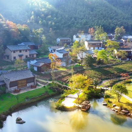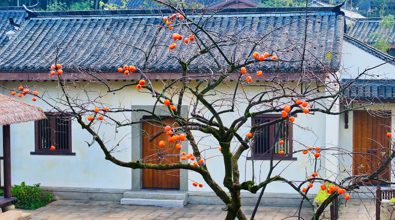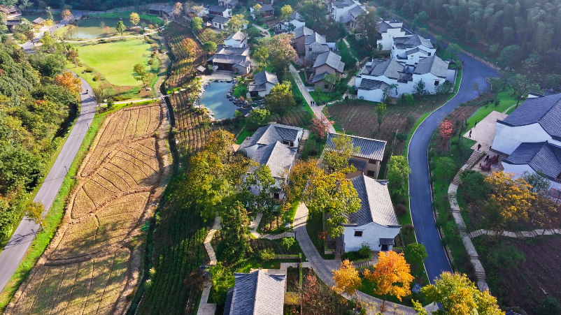 初冬时节,安徽省池州市文宗古村风光旖旎,小桥流水、白墙黛瓦,色彩斑斓的树叶与徽派建筑相映成趣,呈现一幅宁静而美丽的田园风光。