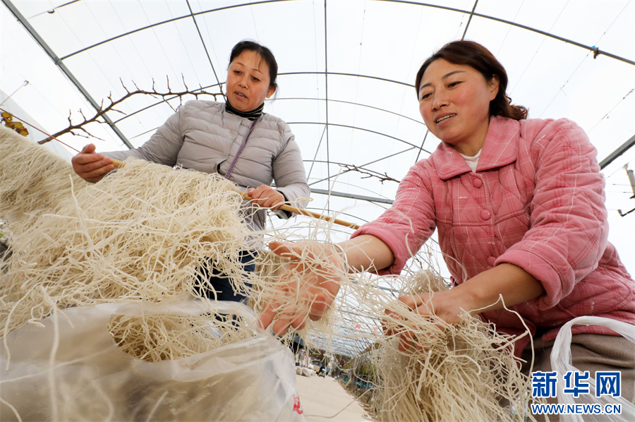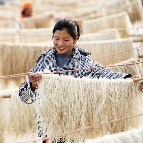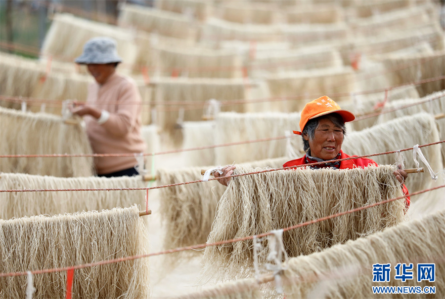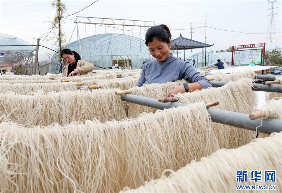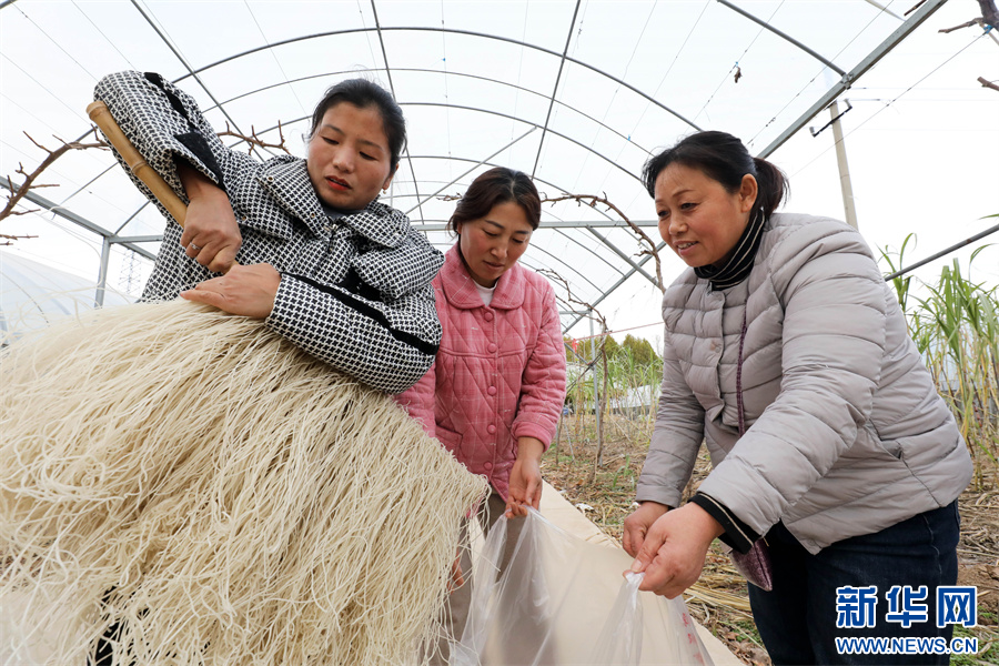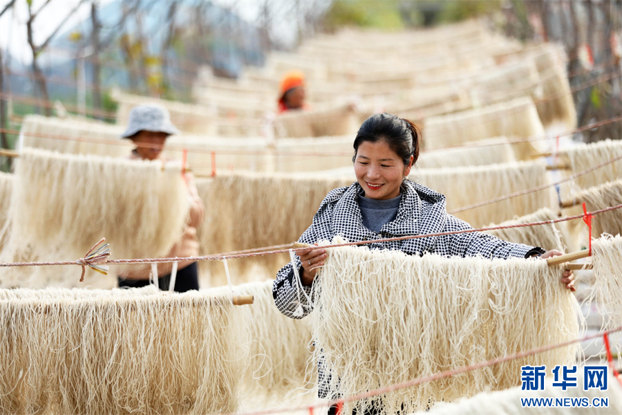 冬日里,当地村民利用农闲时节加工生产传统粉丝,并通过电商平台和线下销售的模式把产品销售到全国各地,形成了一条种植、加工、包装运输、电商销售一体的富民产业链。在满足市场需求的同时,提高了红薯的附加值,增加了收入。新华网发(李鑫 摄)