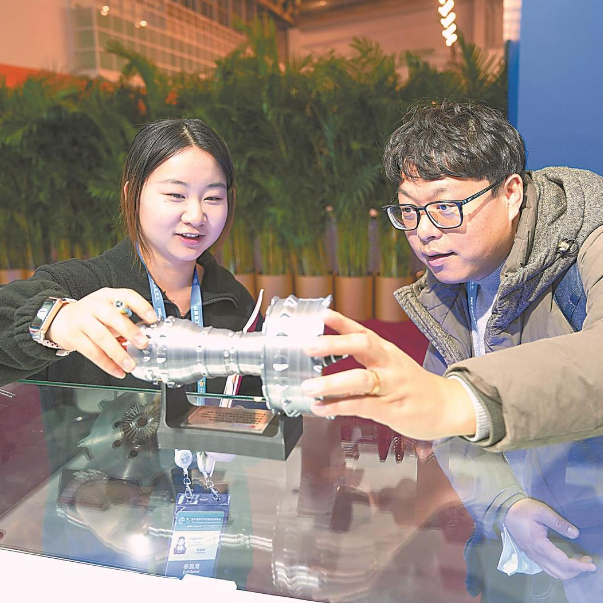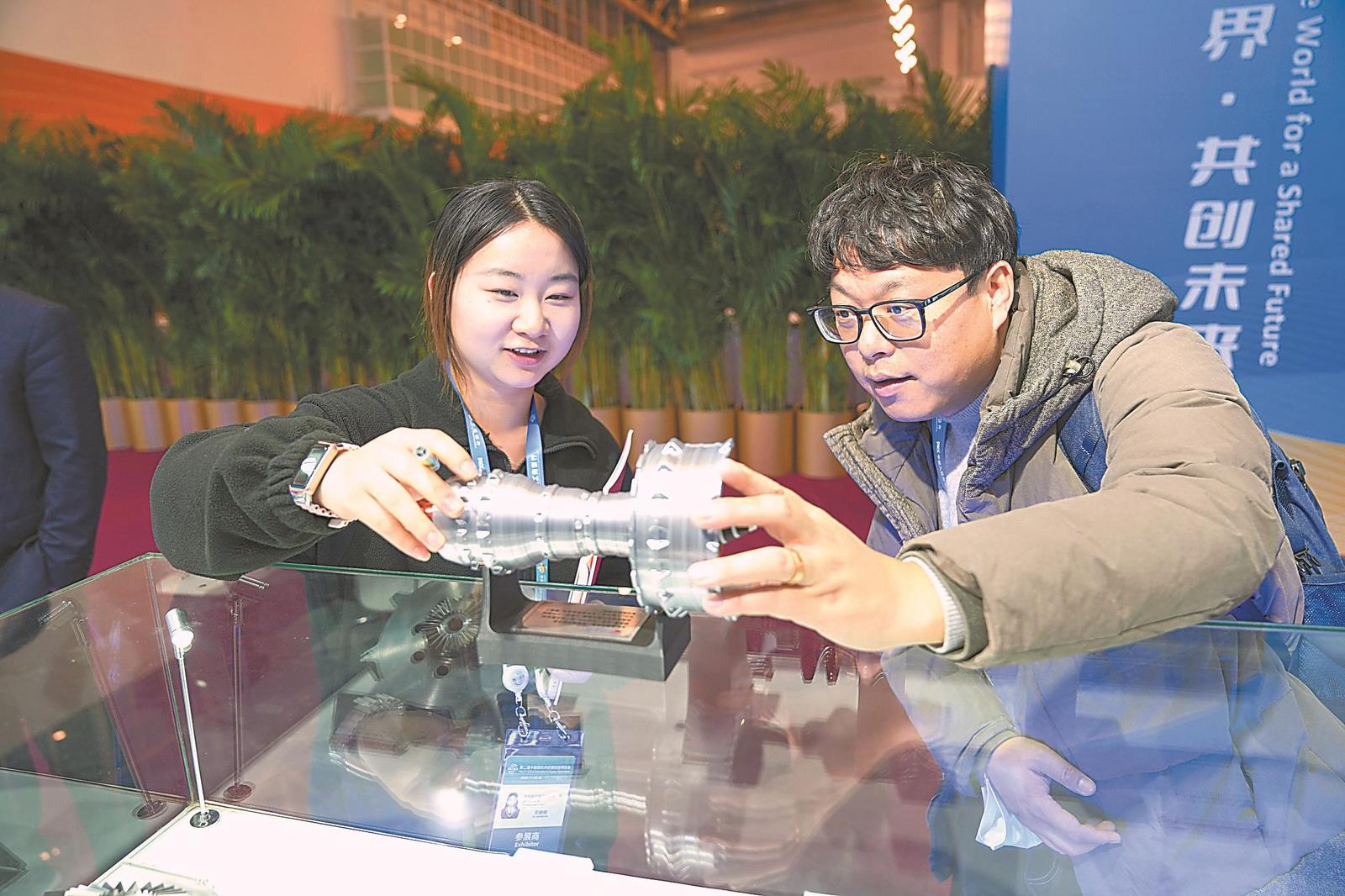 11月27日,雄名航空科工(芜湖)股份有限公司展台前,工作人员在向参观者介绍产品。