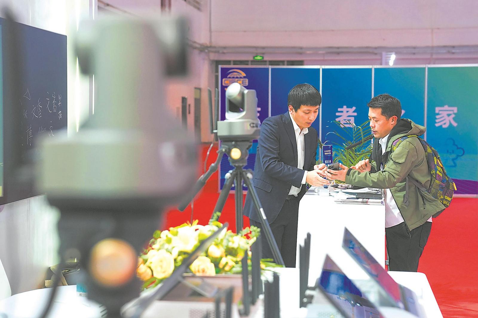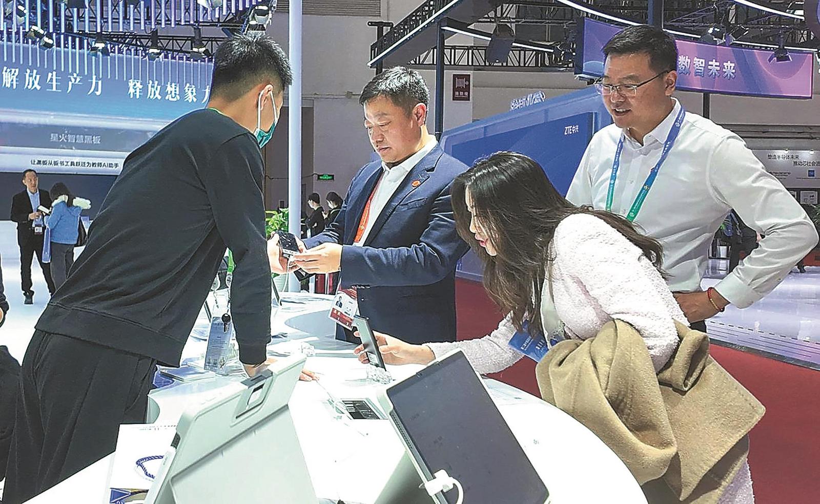 11月27日,安徽文香科技股份有限公司工作人员在向参观者介绍产品。