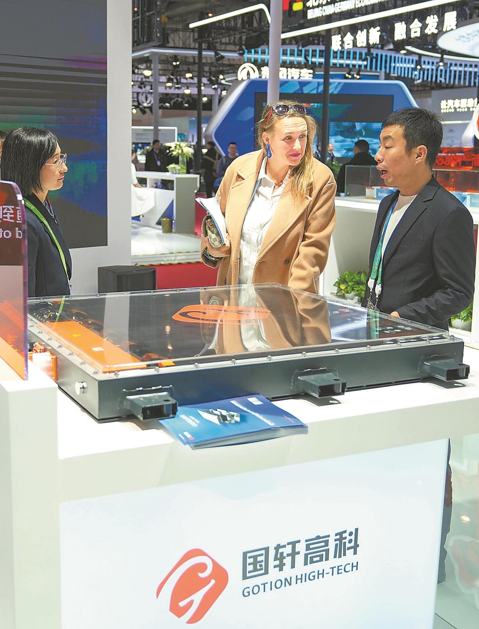 11月28日,国轩高科股份有限公司展台,一名外国客商在了解该公司的产品。